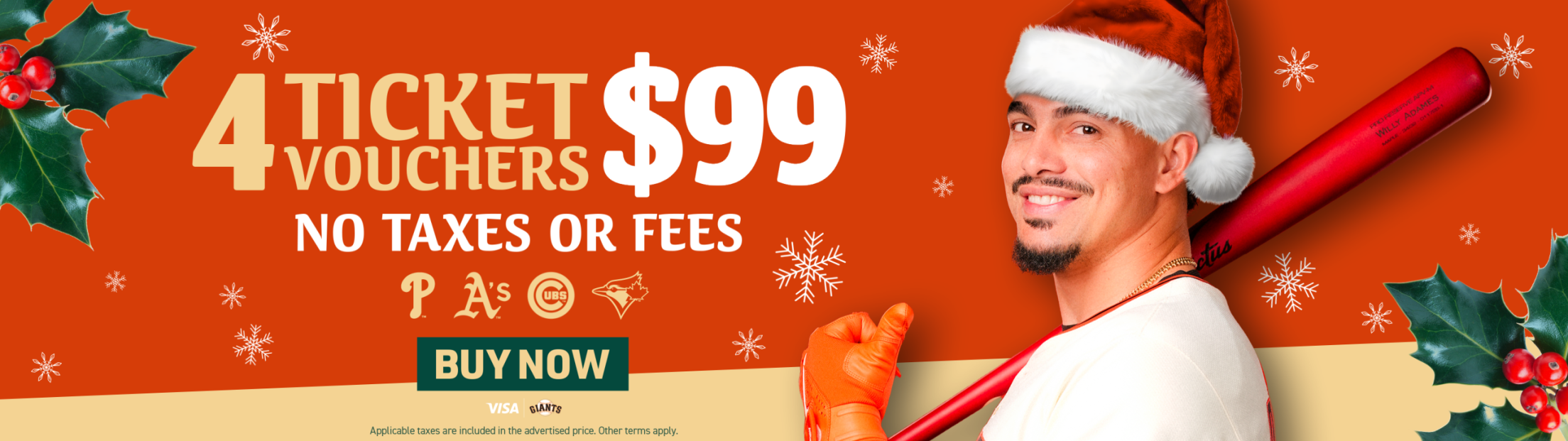 This holiday season, spread cheer with Giants Ticket Vouchers. For only $99, get four ticket vouchers valid for View Reserve and Bleacher seats, or for $199, get four ticket vouchers valid for Lower Level seats. No additional taxes or fees.