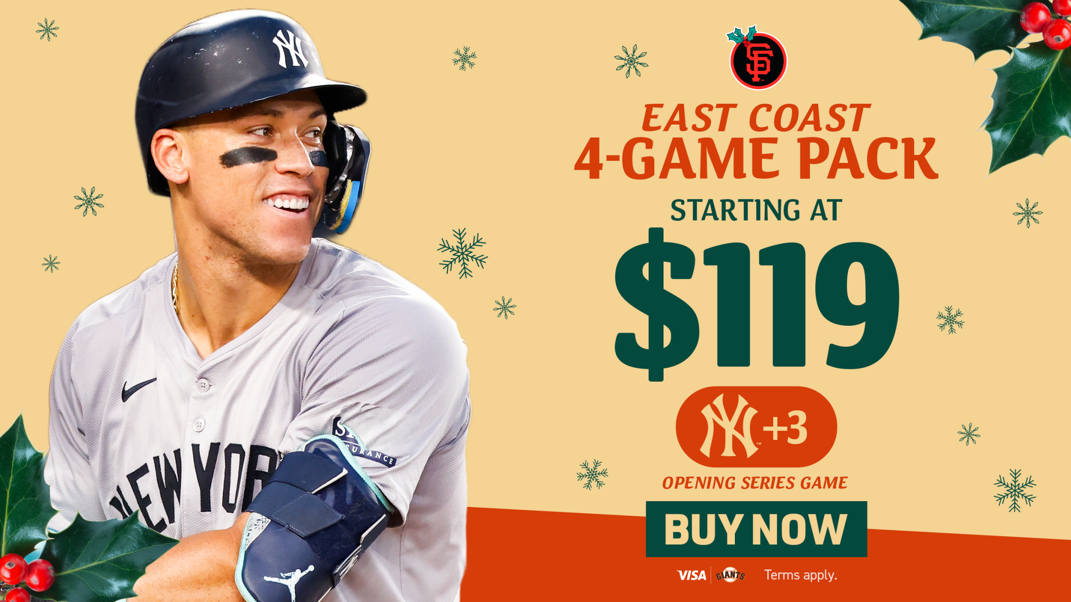 Secure savings toward an Opening Series game of your choice vs. the New York Yankees, March 25-28. Be at Oracle Park to start the 2026 season, plus three additional games vs. the Miami Marlins, Pittsburgh Pirates and Washington Nationals. Including specially priced tickets, the East Coast 4-Game Pack starts at $119.