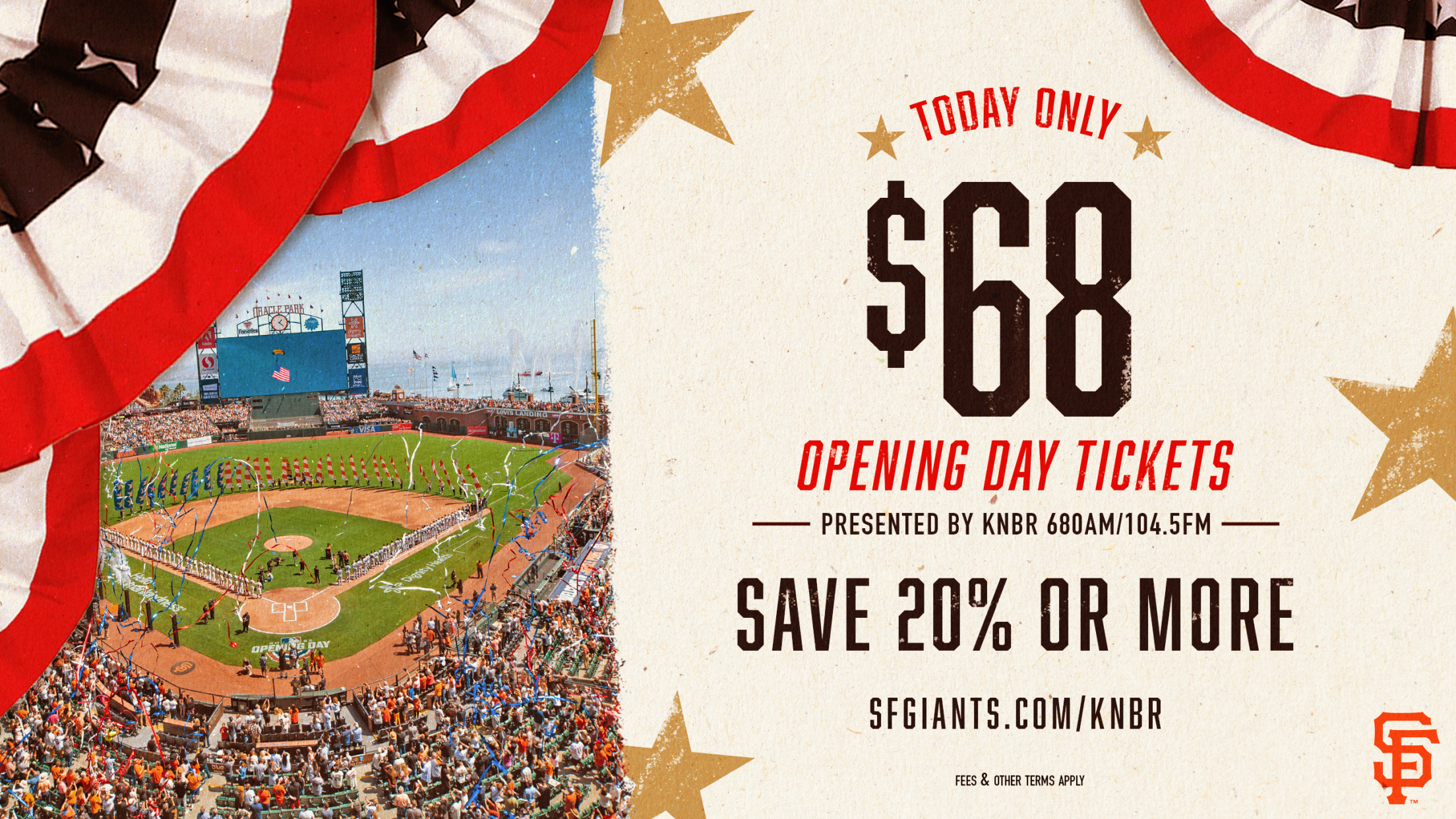 $68 Opening Day tickets presented by KNBR 680AM/104.5FM are not eligible for resale. Any attempted sale may result in the revocation of certain or all tickets purchased, without a refund.