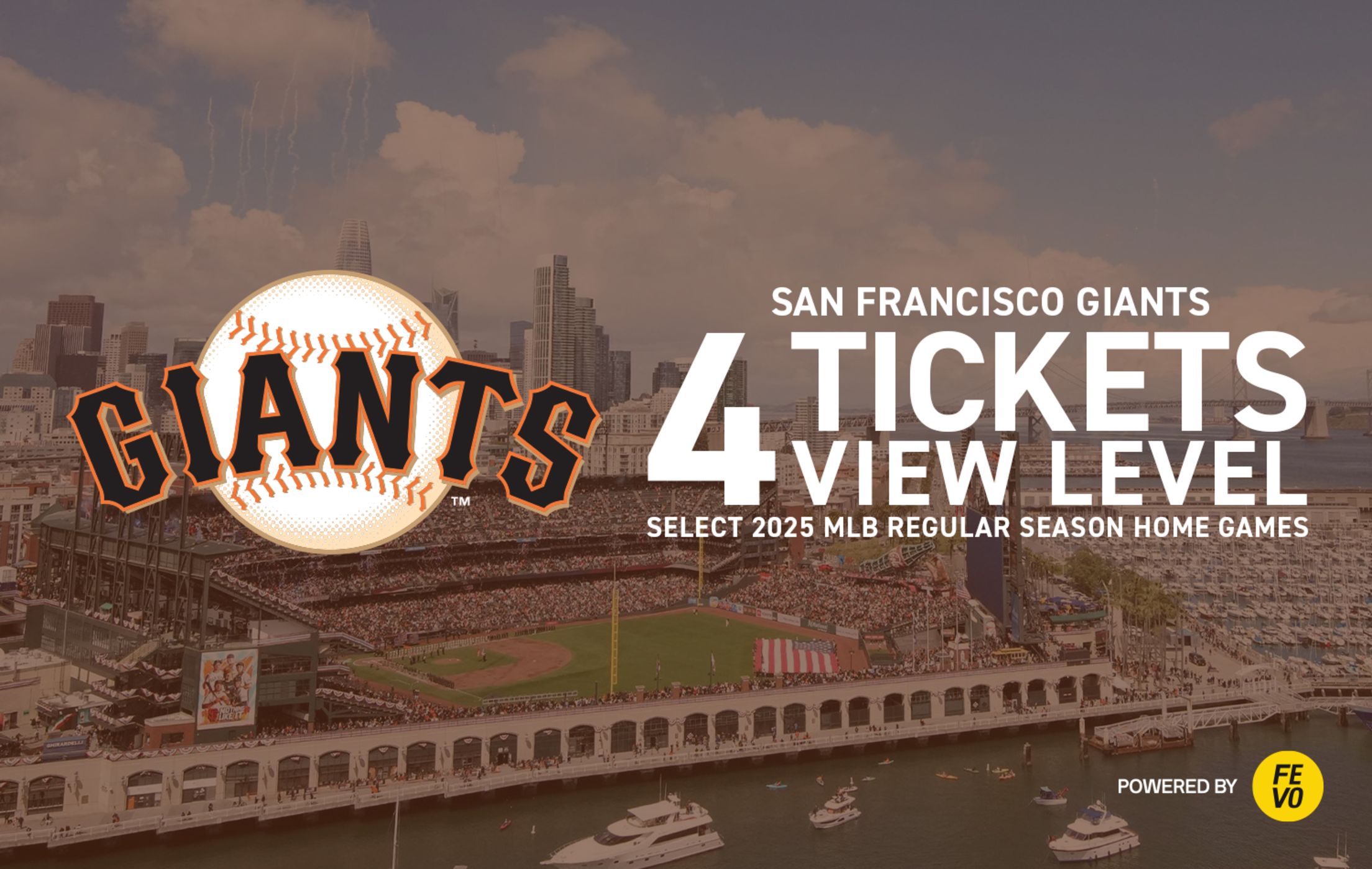 Each voucher is valid for four (4) tickets in the View Level to select 2025 regular season Giants games at Oracle Park, subject to availability. Available seating categories include View Box, View Box Outfield, View Box Left Field, View Reserve Infield, View Reserve, View Reserve Outfield, and View Reserve Left Field, and will vary by game. Additional seating categories may be made available for select games.