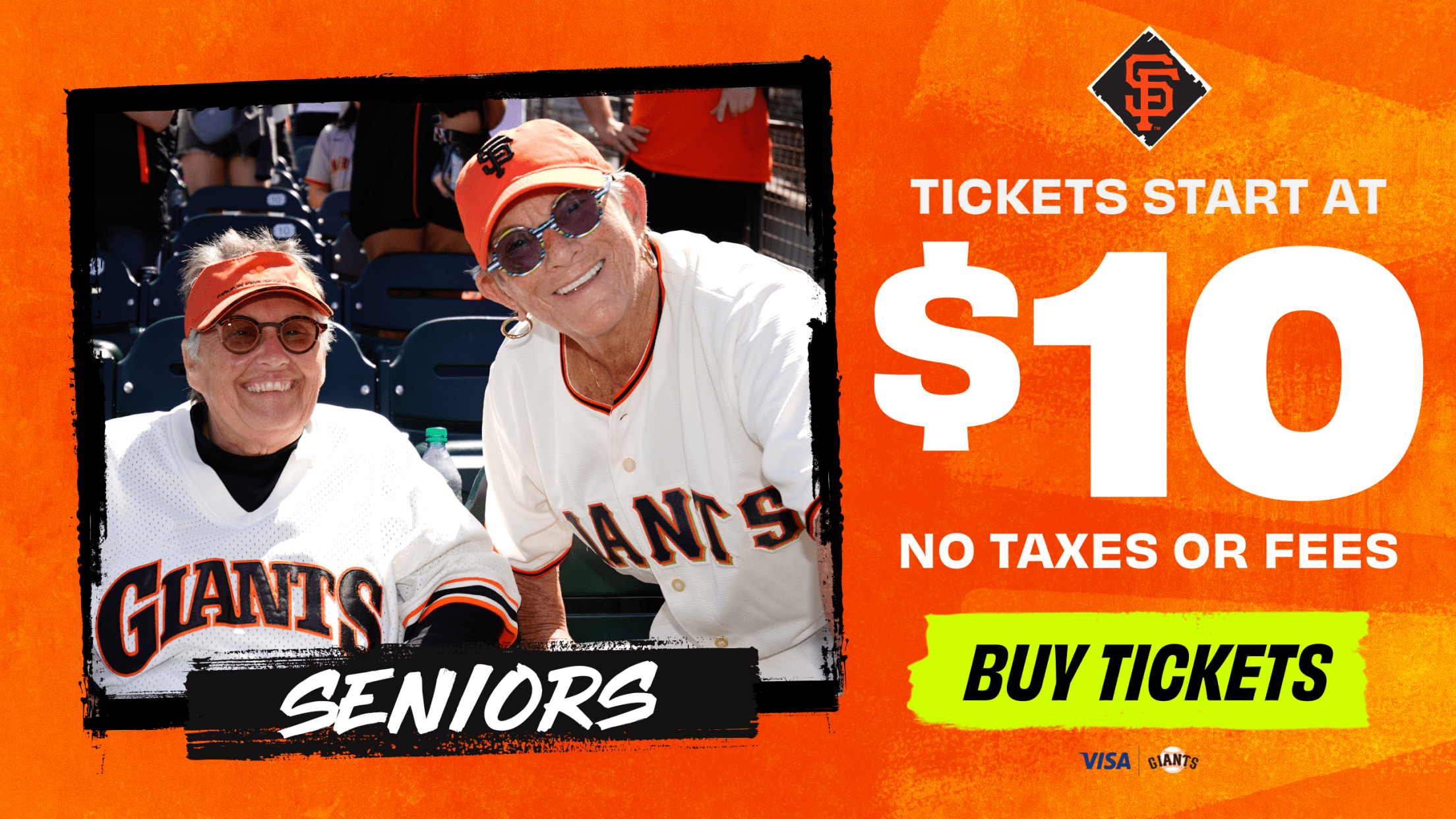 Spend an afternoon with the Giants at Oracle Park. Fans 60+ can secure tickets for as low as $10, no added taxes or fees. With this offer, seniors get a 40% discount on tickets to all Sunday-Thursday day games (excluding games vs. LAD) and save up to 40% on all other games.