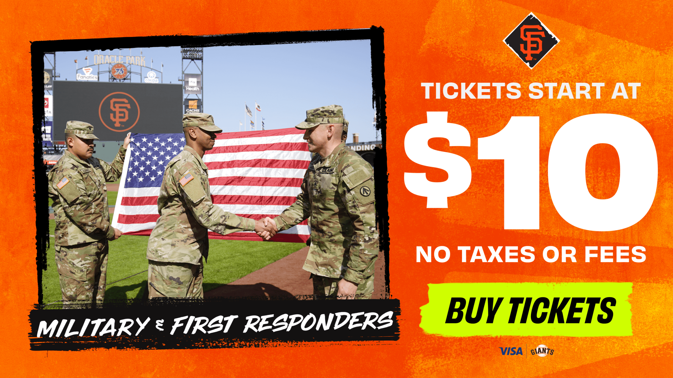 To show our gratitude for your service, all military personnel, first responders and government officials save a minimum of 10% on tickets to all Giants home games. For select games, enjoy up to 40% off with tickets for as low as $10, no added taxes or fees.