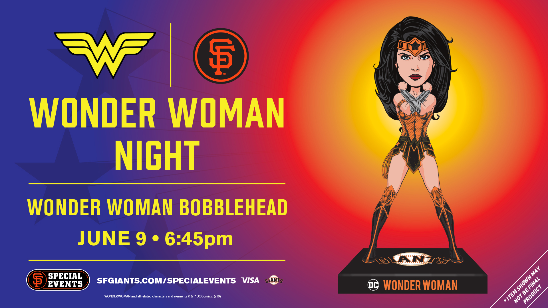 In anticipation of the newest film release from DC and Warner Bros. Studios, join us for our first Wonder Woman Night. Help us celebrate one of the most powerful and admired superheroes of all time. Your Special Event ticket includes a limited edition Giants-themed Wonder Woman Bobblehead.