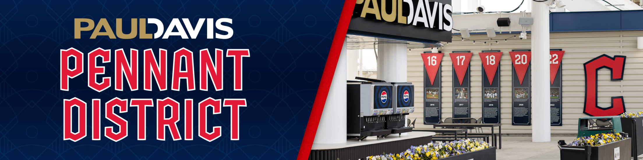 The Paul Davis Pennant District is Progressive Field's first dedicated group space, offering terrace views of the ballpark and city skyline. Perfect for groups of 100–1,500, it features an all-you-can-eat buffet from gate opening to one hour after the first pitch, with a mix of seating and high-top tables for a relaxed, intimate experience. Located on the Right Field Upper Deck, it’s ideal for hosting memorable events.
