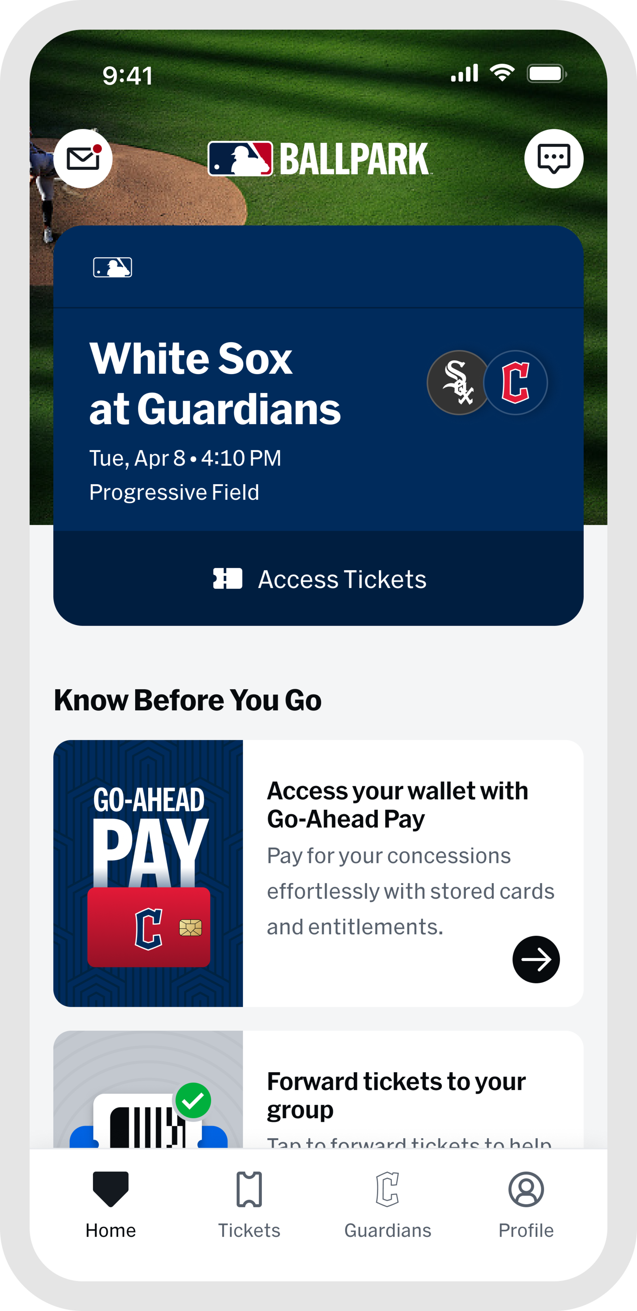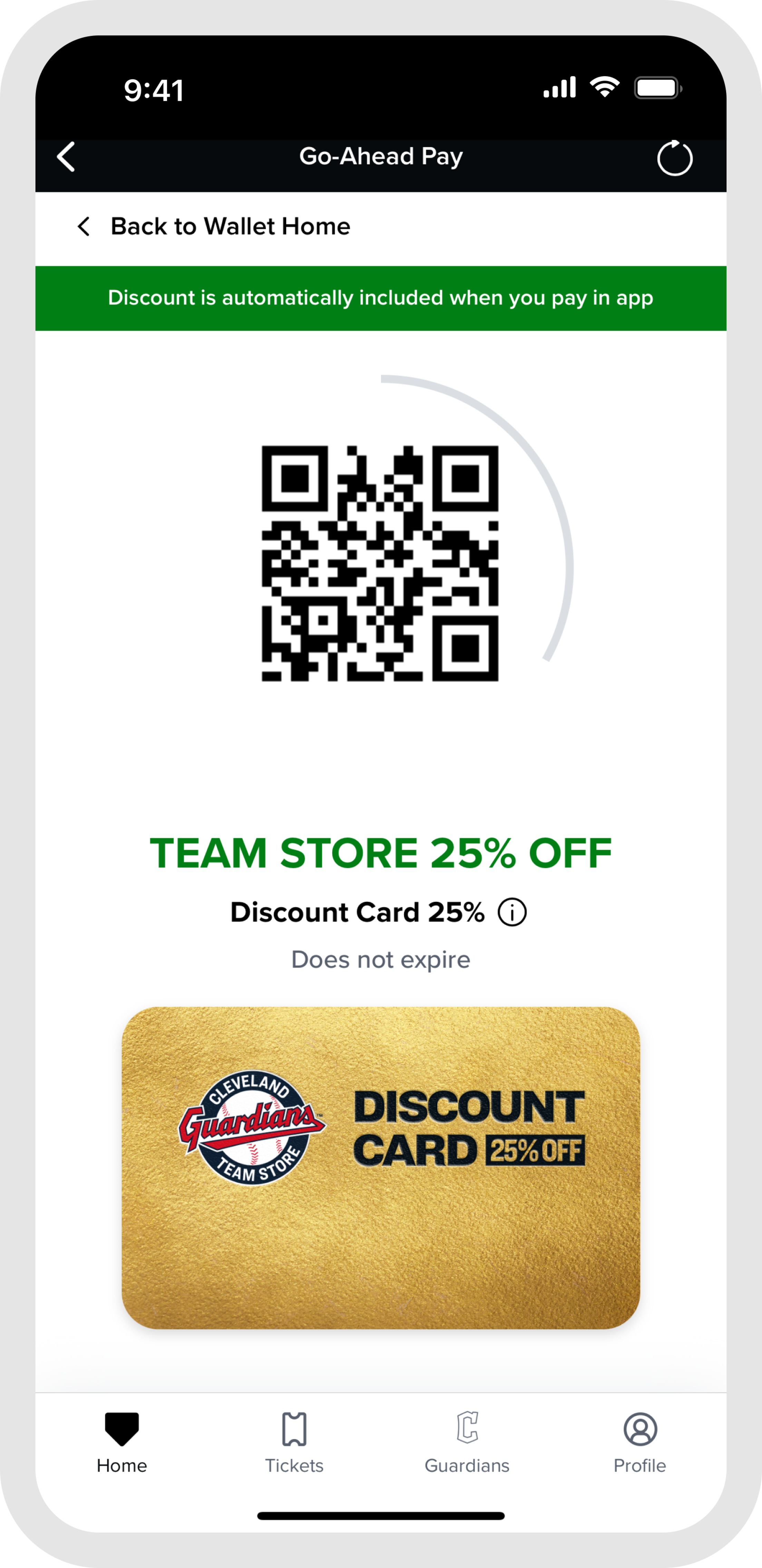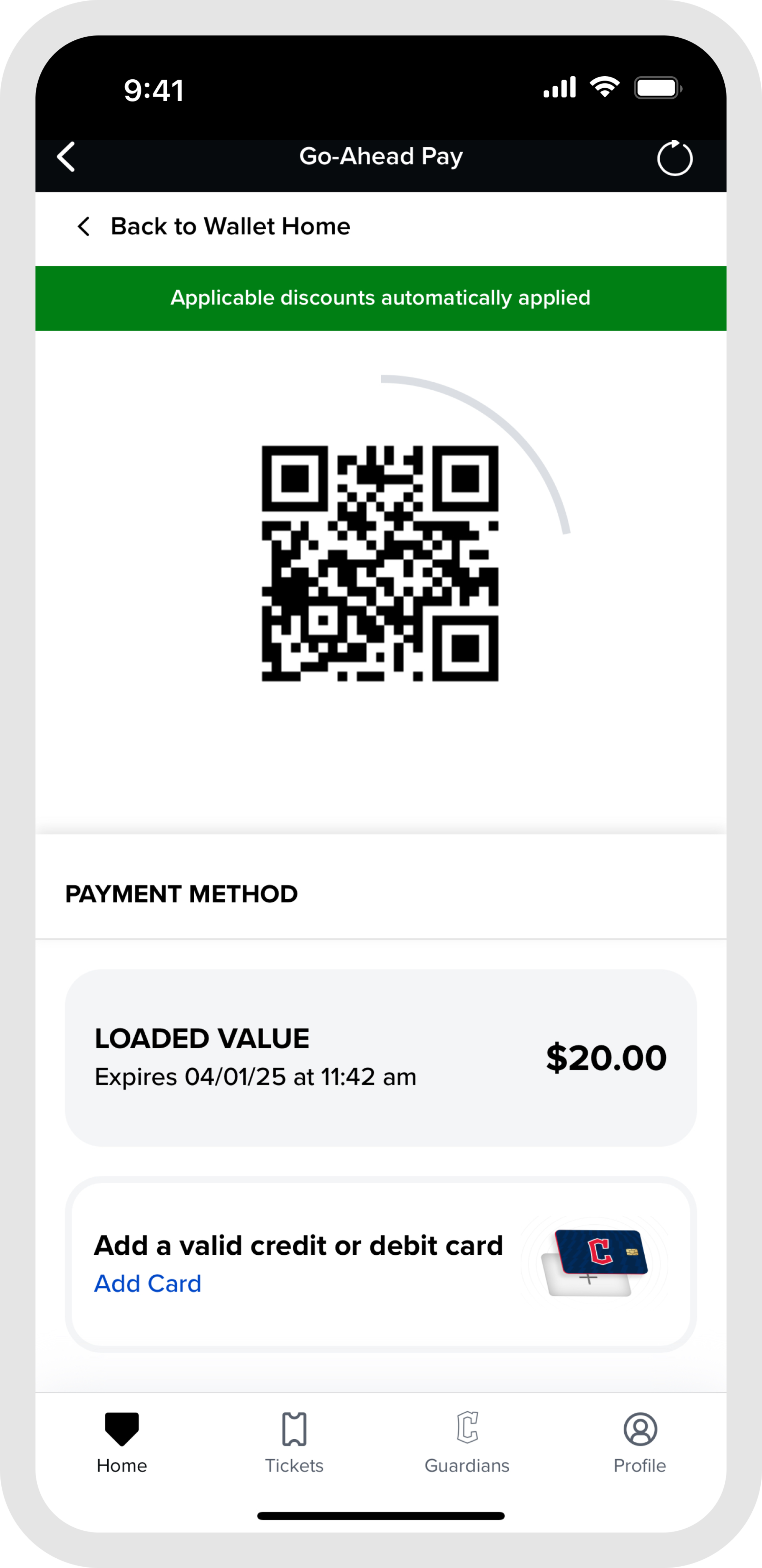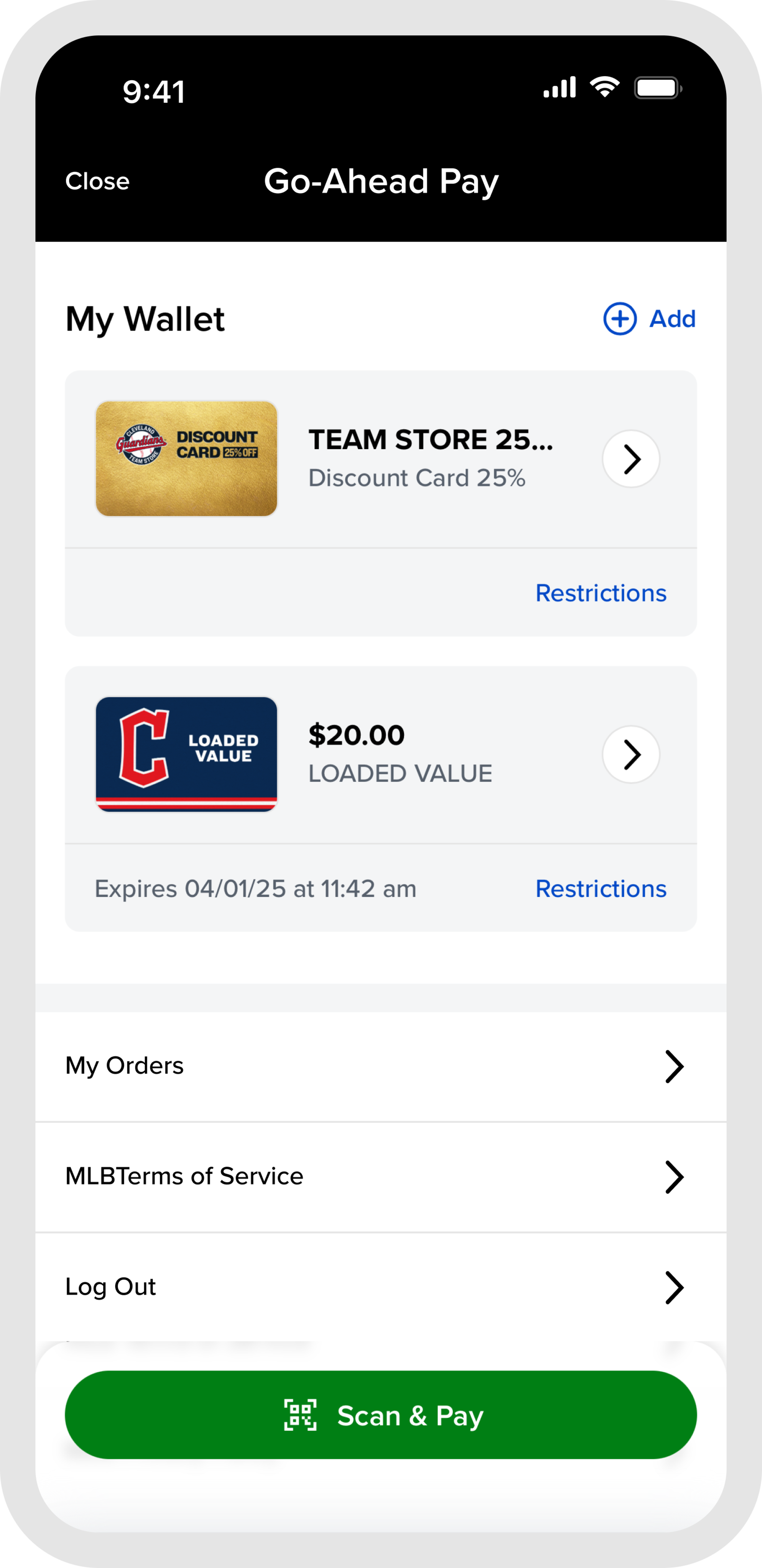 Select “Scan & Pay” to present or scan a unique QR code that includes your payment card and any applicable loaded value or discounts for concession and merchandise purchases at the ballpark