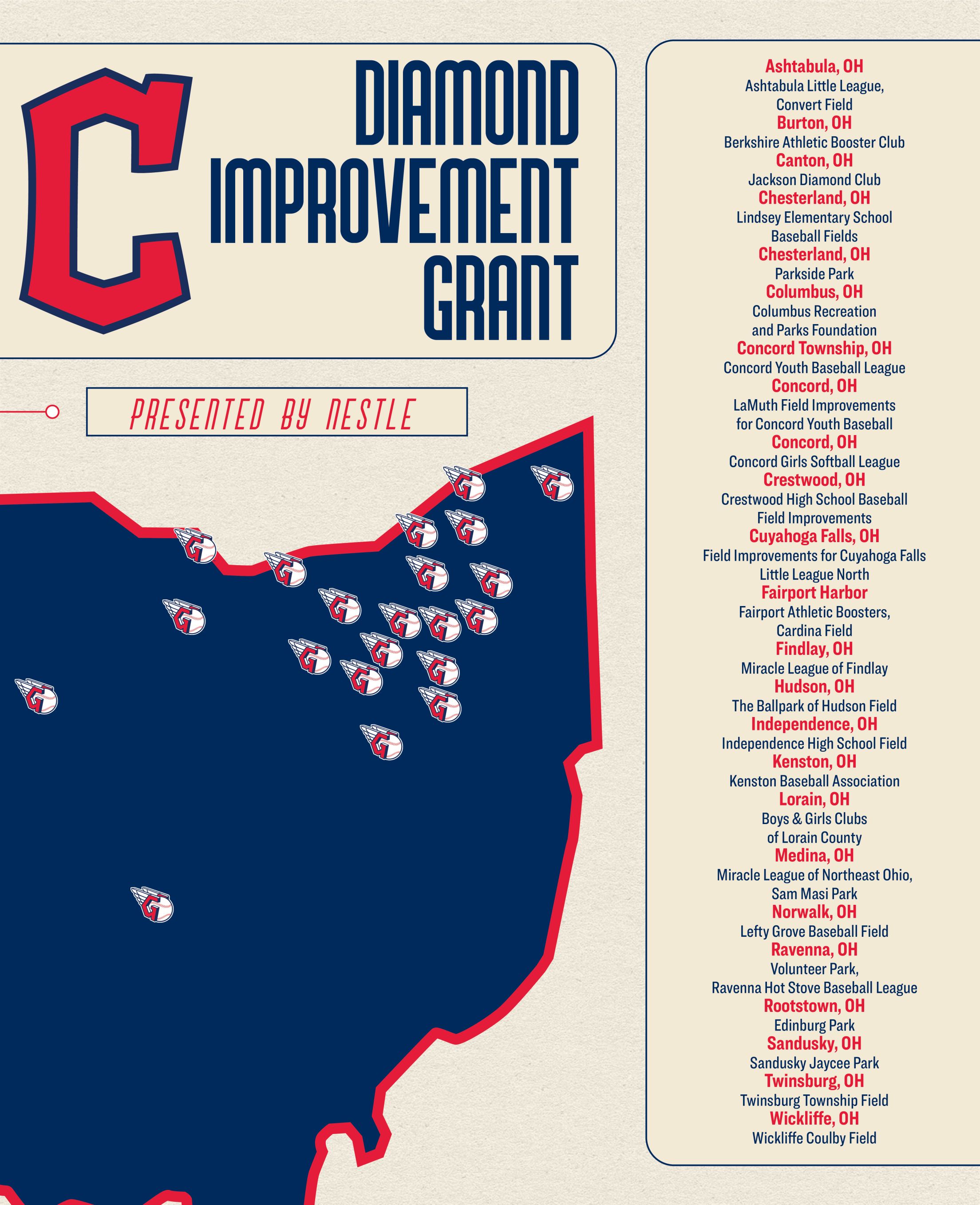 The Diamond Improvement Grant presented by Nestlé, is dedicated to ensuring that youth across Northeast Ohio have access to safe, high-quality, and playable ballfields. This grant program supports local league funding, programming, and the renovation of playing fields, helping to foster a love for baseball and softball in communities that need it most.