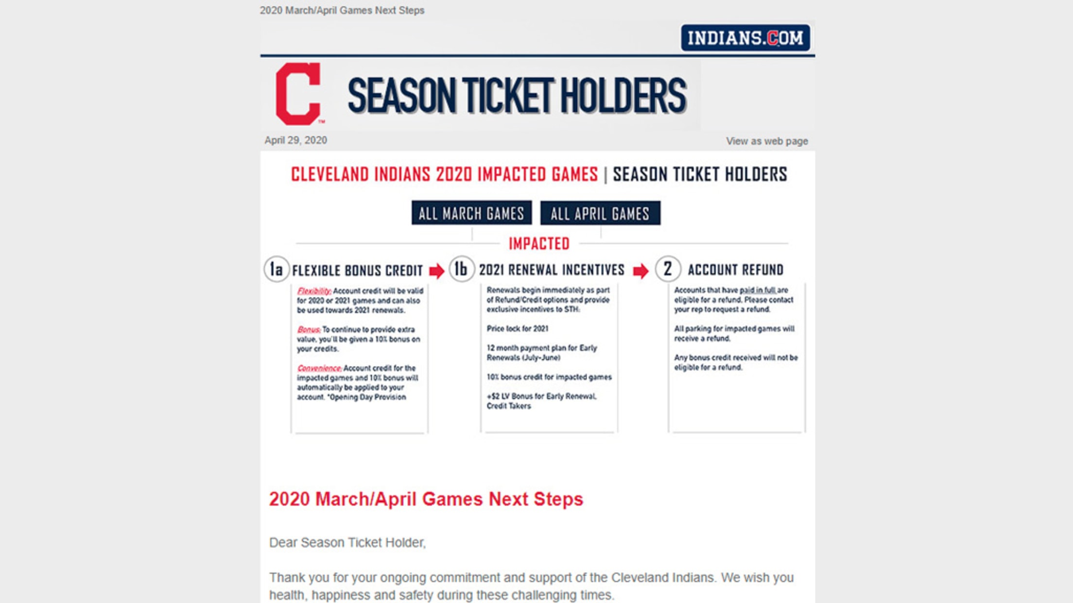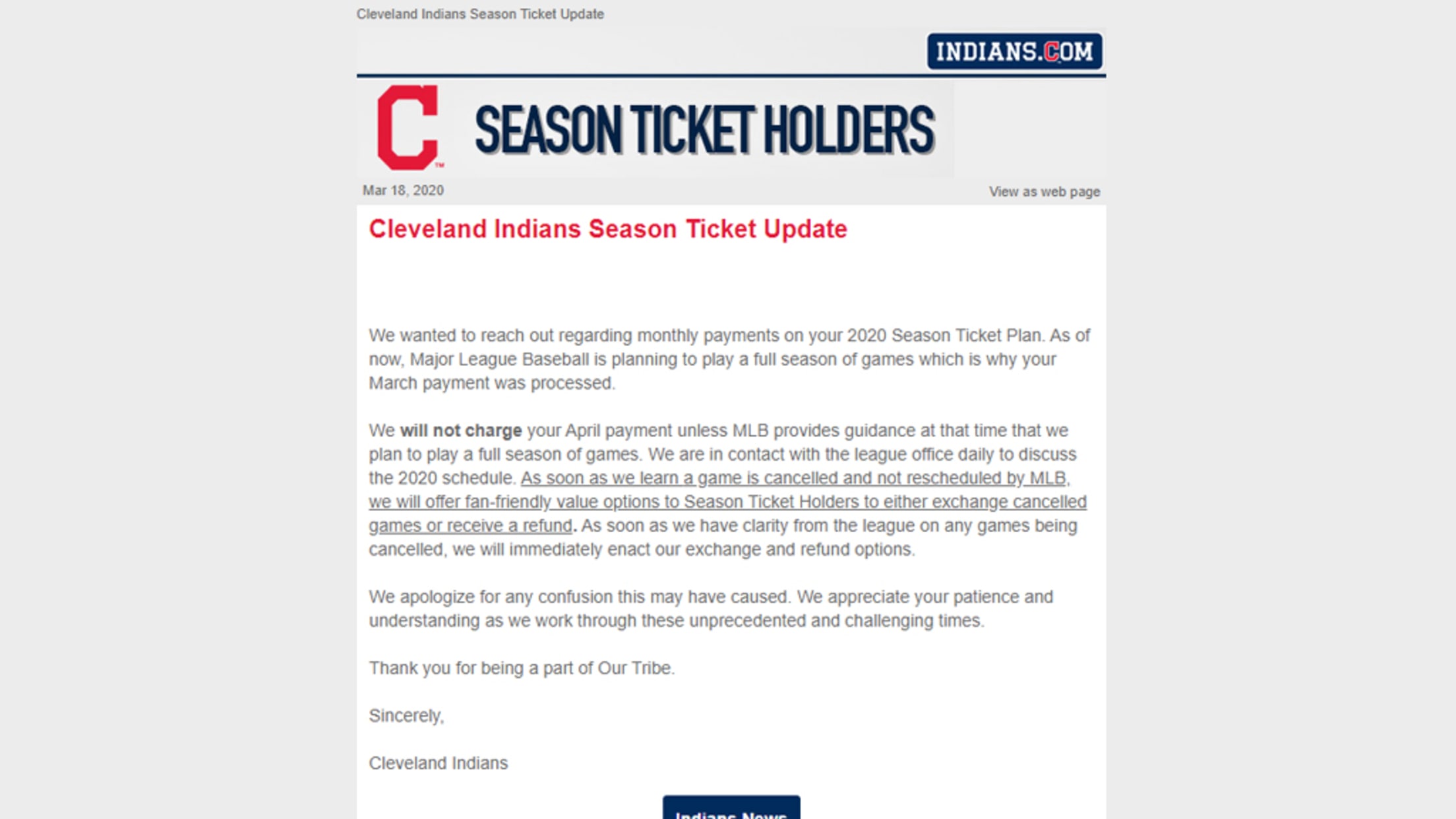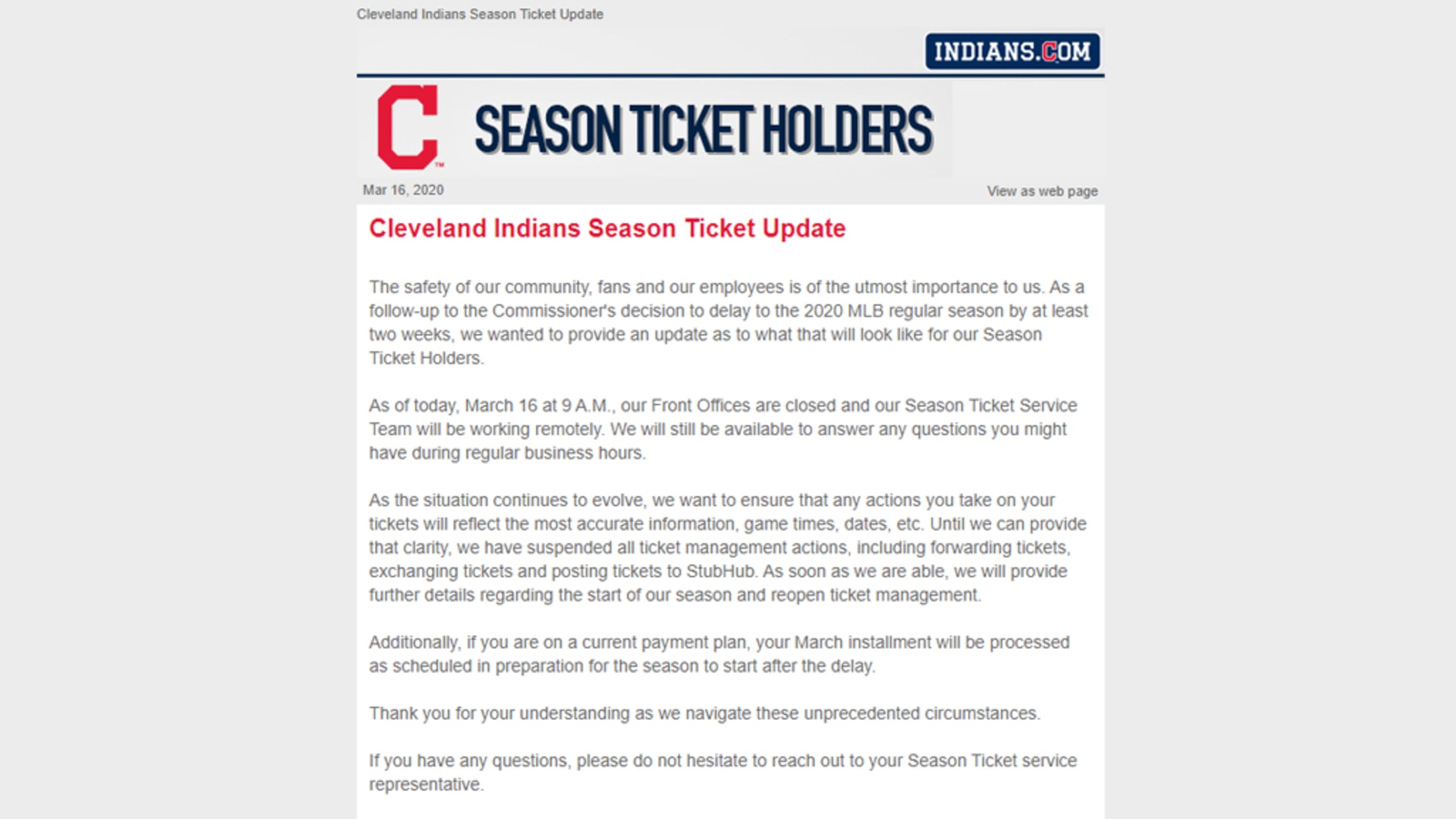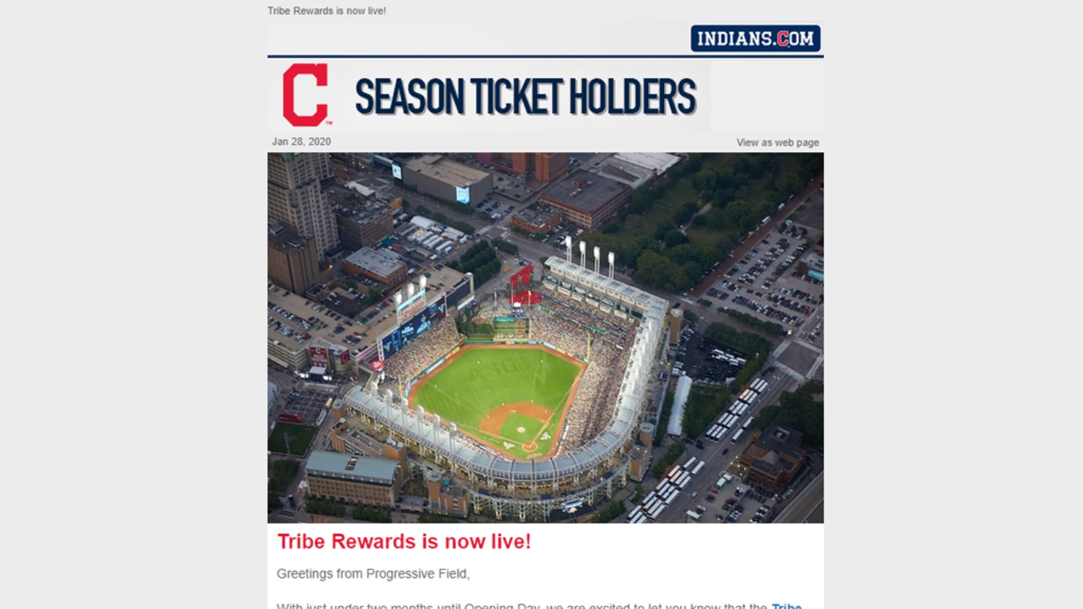 If you are having trouble receiving e-mails, please add feedback@mail.mlblists.com to your e-mail contacts to ensure you get the latest Indians Season Ticket Holder emails.