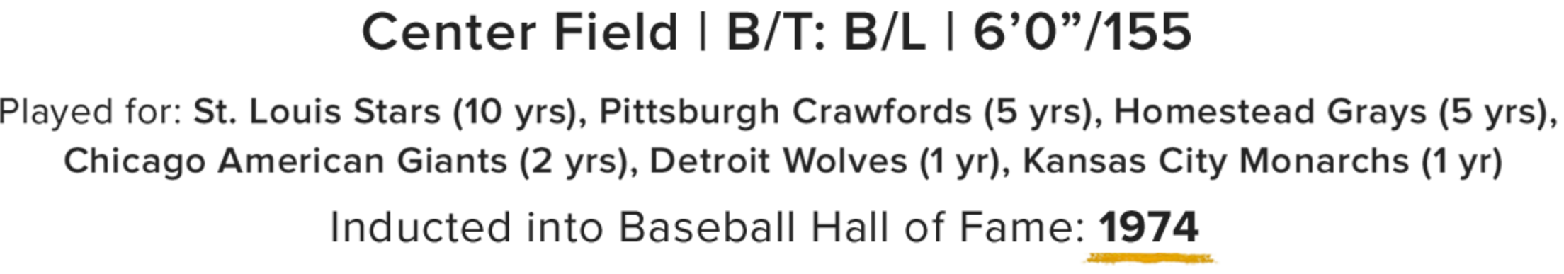 Bell played in the Negro Leagues from 1922-46, the year before Jackie Robinson broke the color barrier in Major League Baseball. Bell is legendary for his speed, taking two or even three bases on a bunt, beating out ground balls back to the mound, and registering as nothing more than a blur around the bases for 27 years. He played shallow in center field because he was able to go back and run down just about anything hit over his head that stayed in the ballpark.