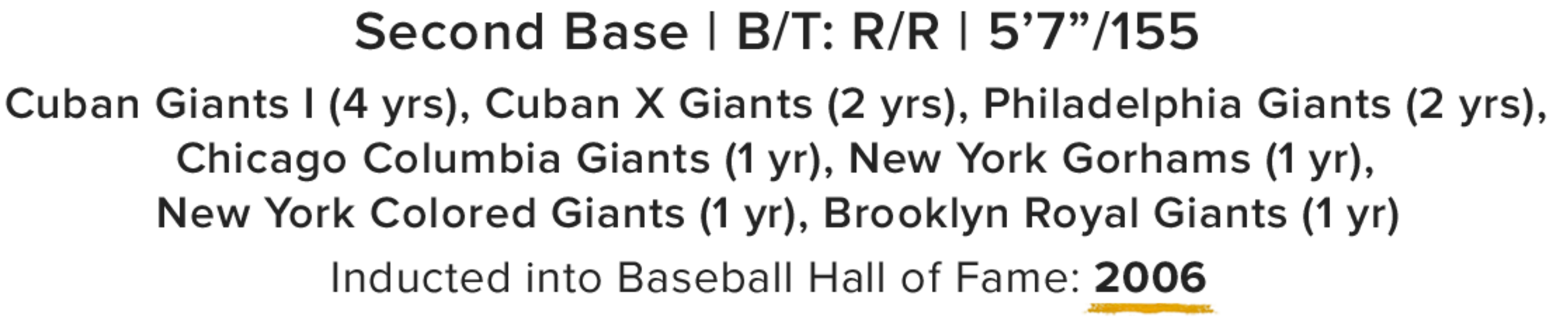 Grant's Hall of Fame plaque reads, in part, “One of baseball’s early stars who became an inspiration for future generations of African American ballplayers. … Segregation eventually forced him to play for top touring Black teams, notably the Cuban Giants, where he served as team captain and often mentored younger players.”