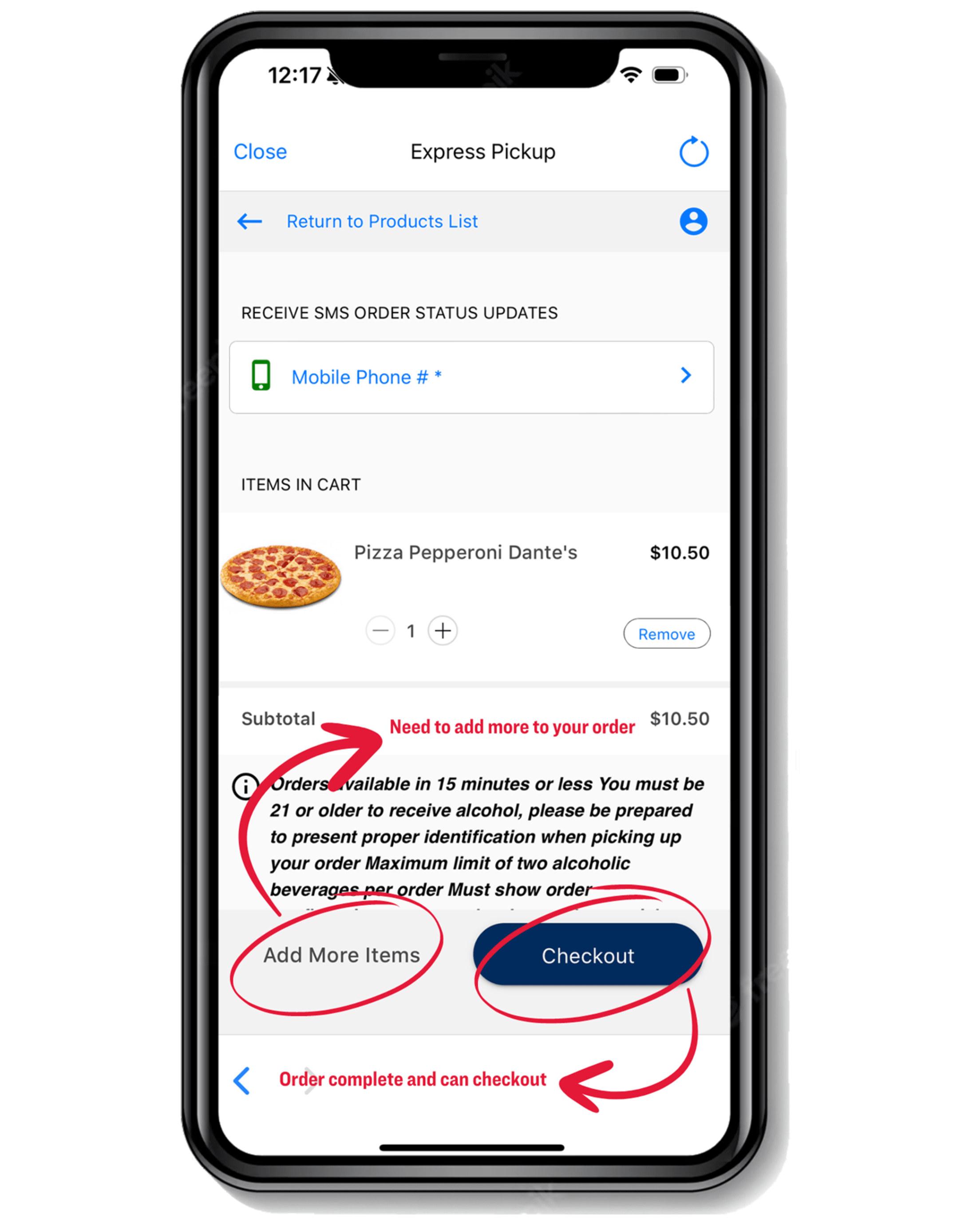 Choose either “Add More Items” or tap “Checkout” to select payment method.