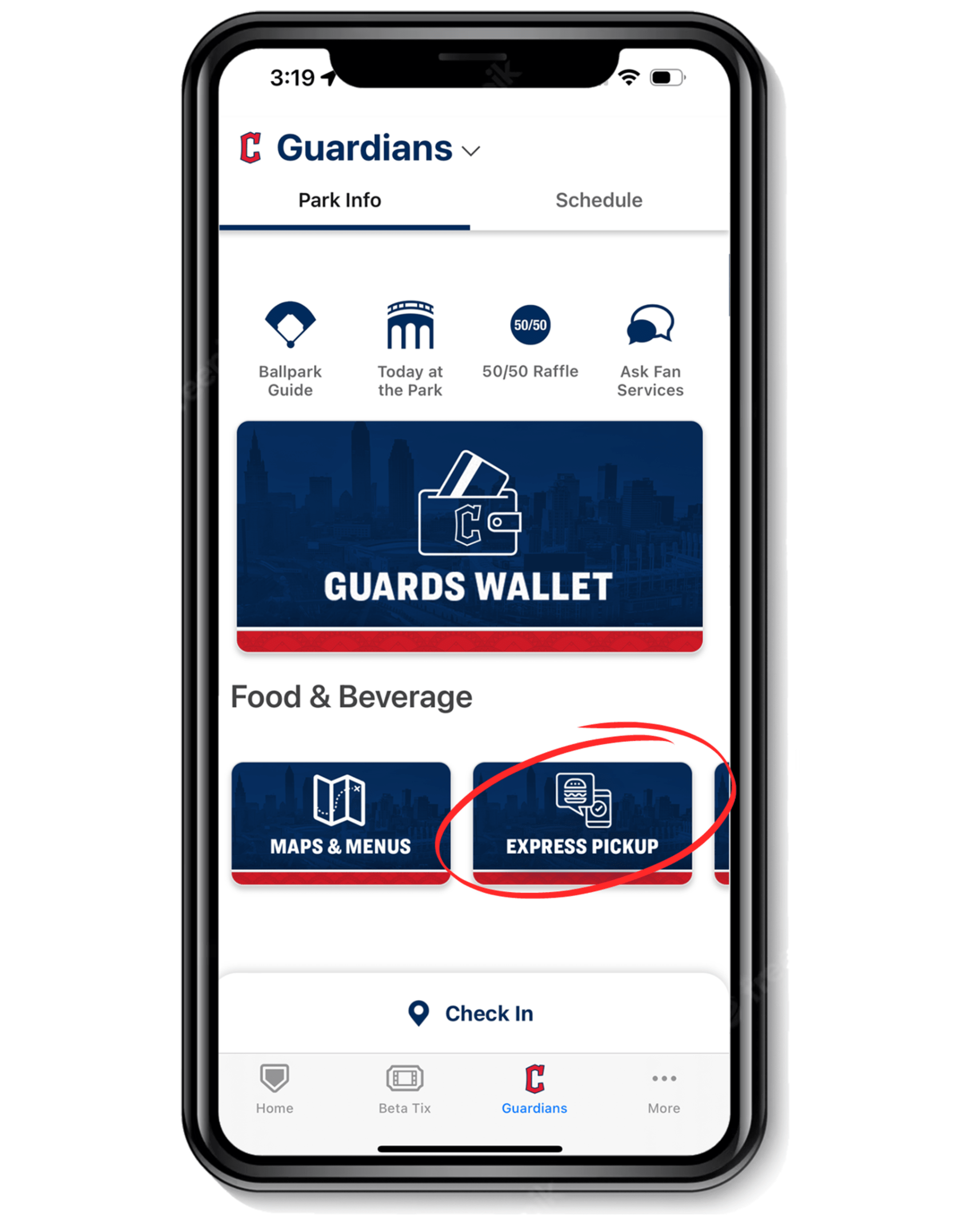 Open the MLB Ballpark app to the Cleveland Guardians team page and tap the Express Pickup tile or scan an Express Pickup QR code.