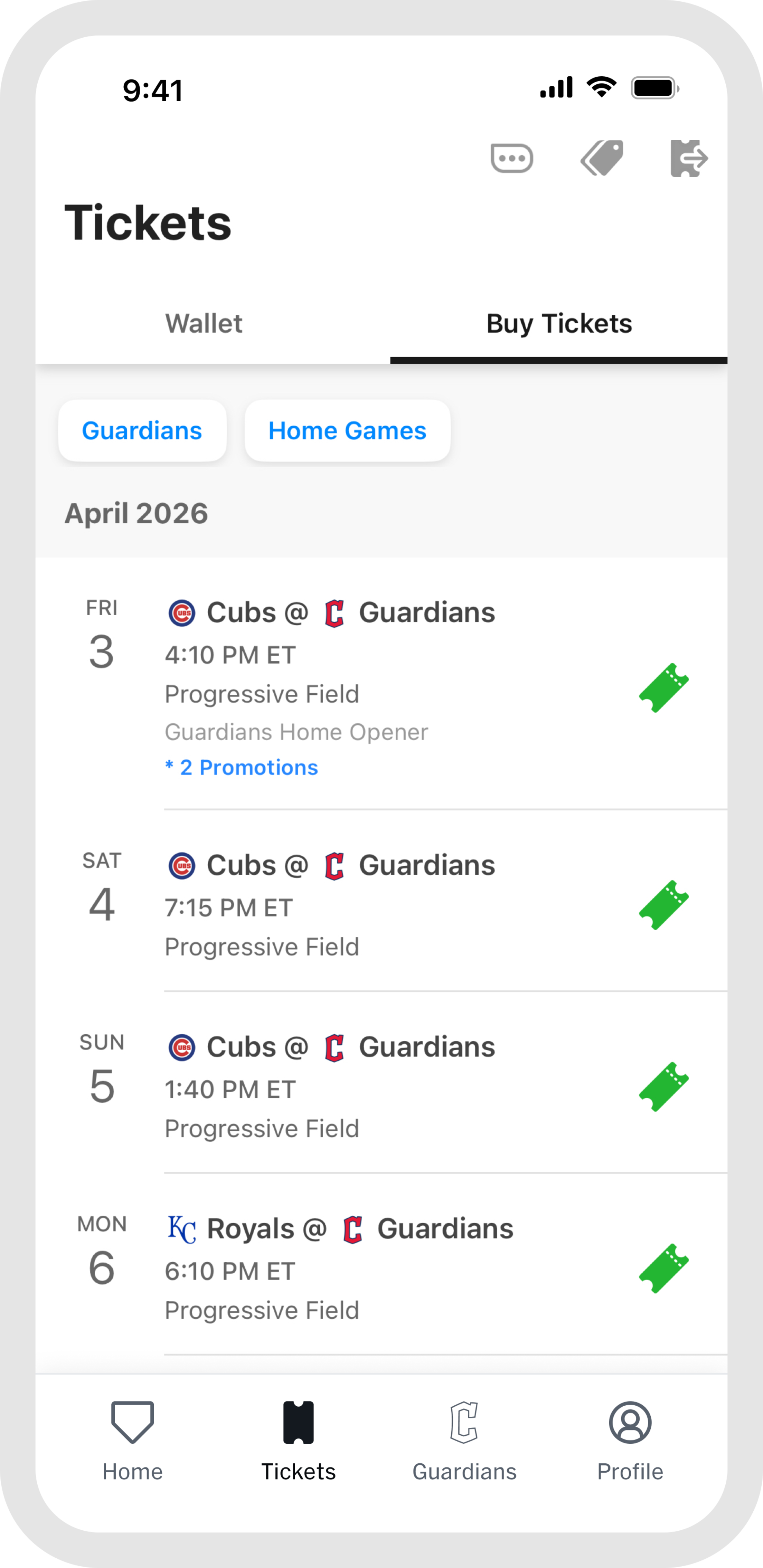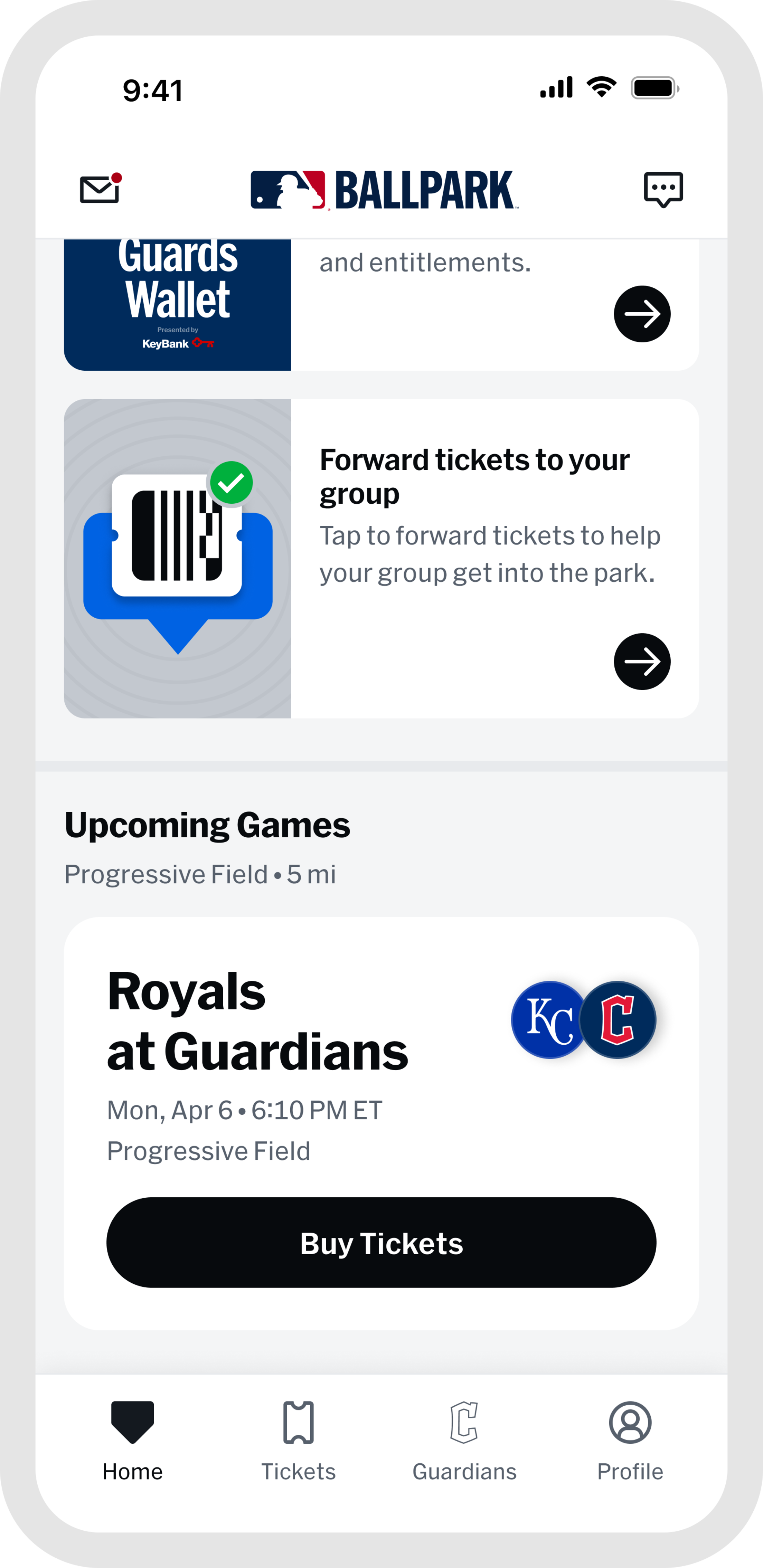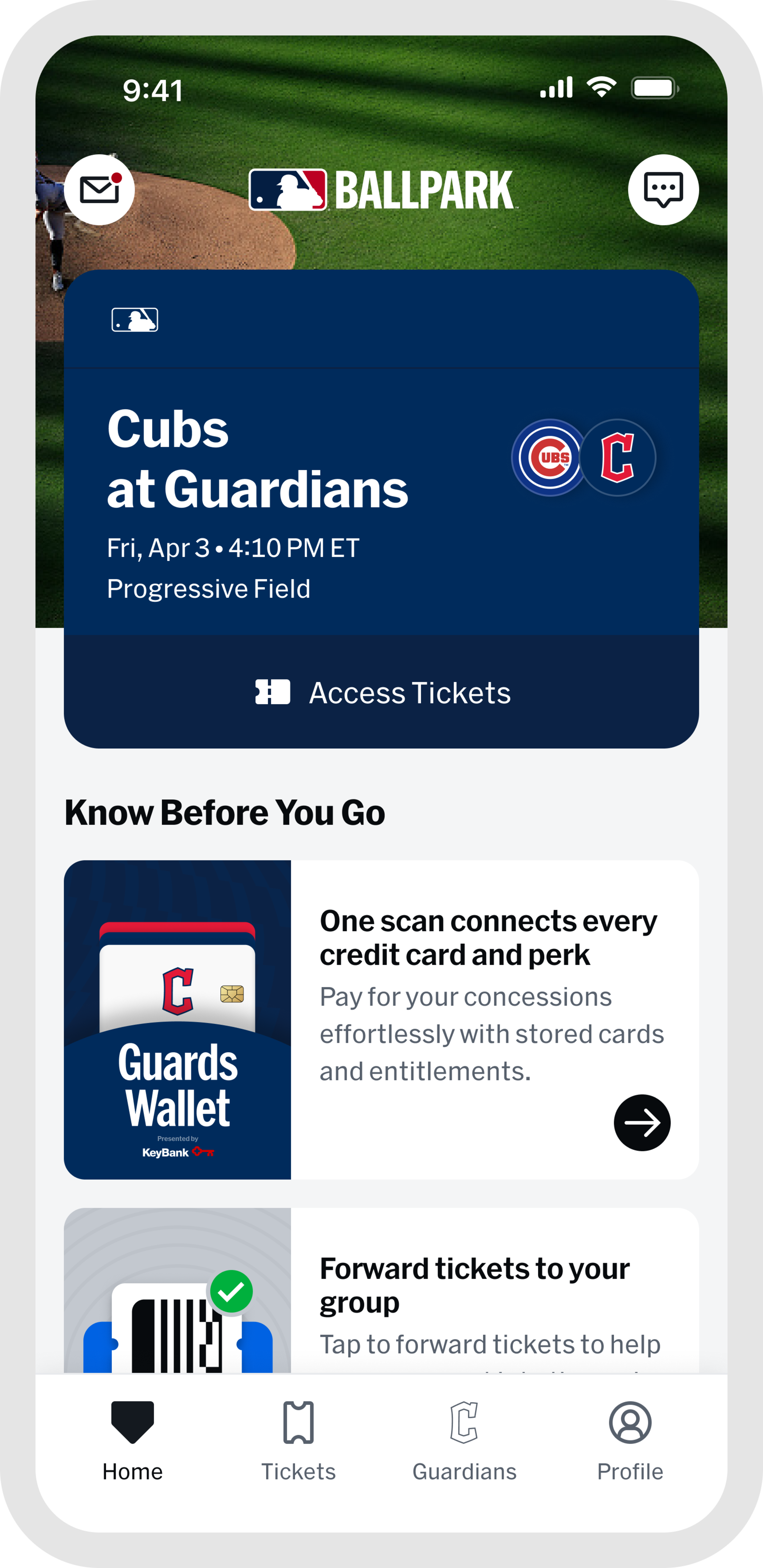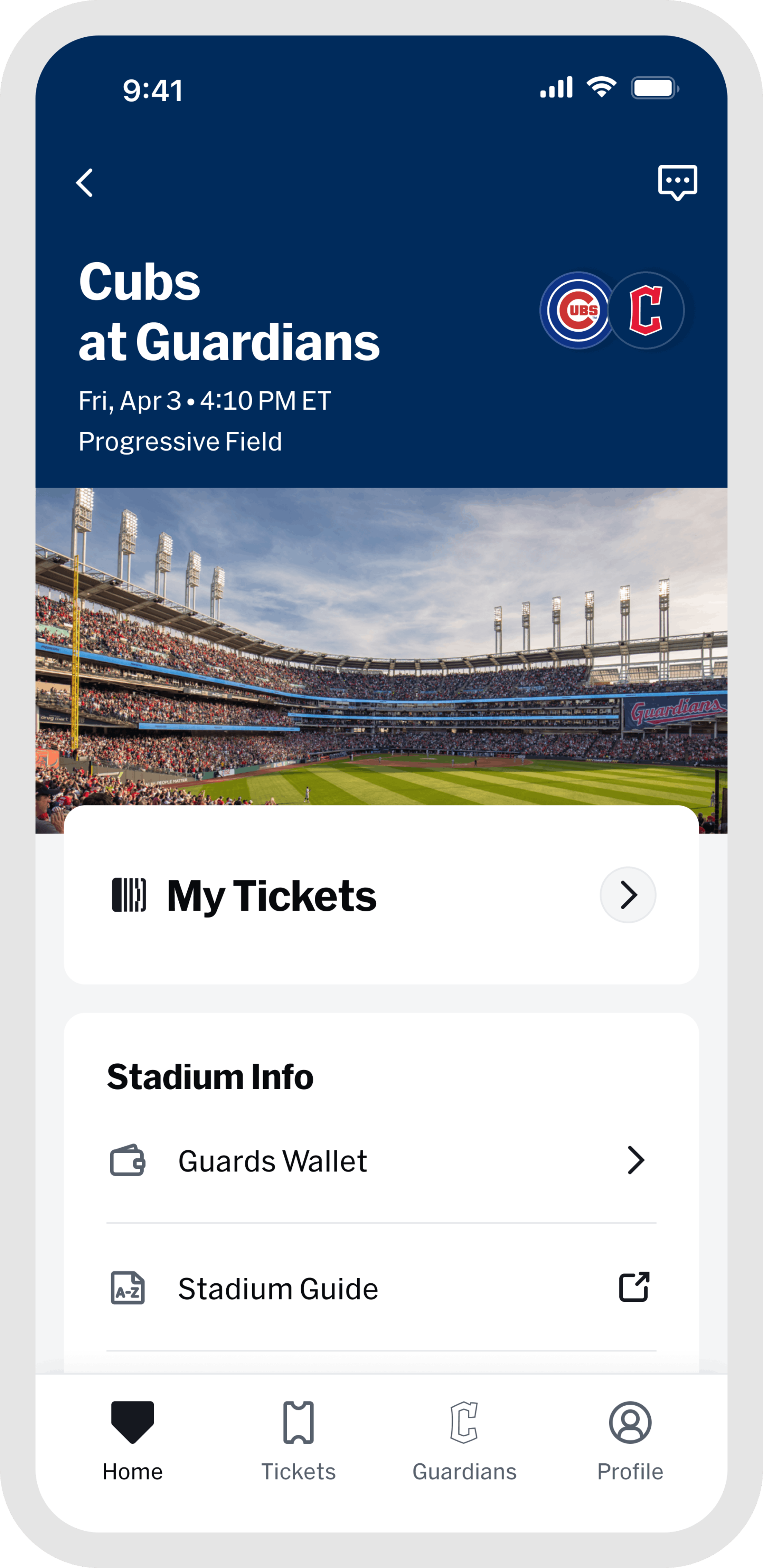 Once you are at the game, the "Home" and "Guardians" tabs are your go-to for everything venue-related. Browse stadium maps, jump into interactive games, find concession info, and access in-game features all designed to make your experience better from first pitch to final out. When the game wraps up, head to "My History" in the "Profile" tab to revisit every game you have attended, all in one place.