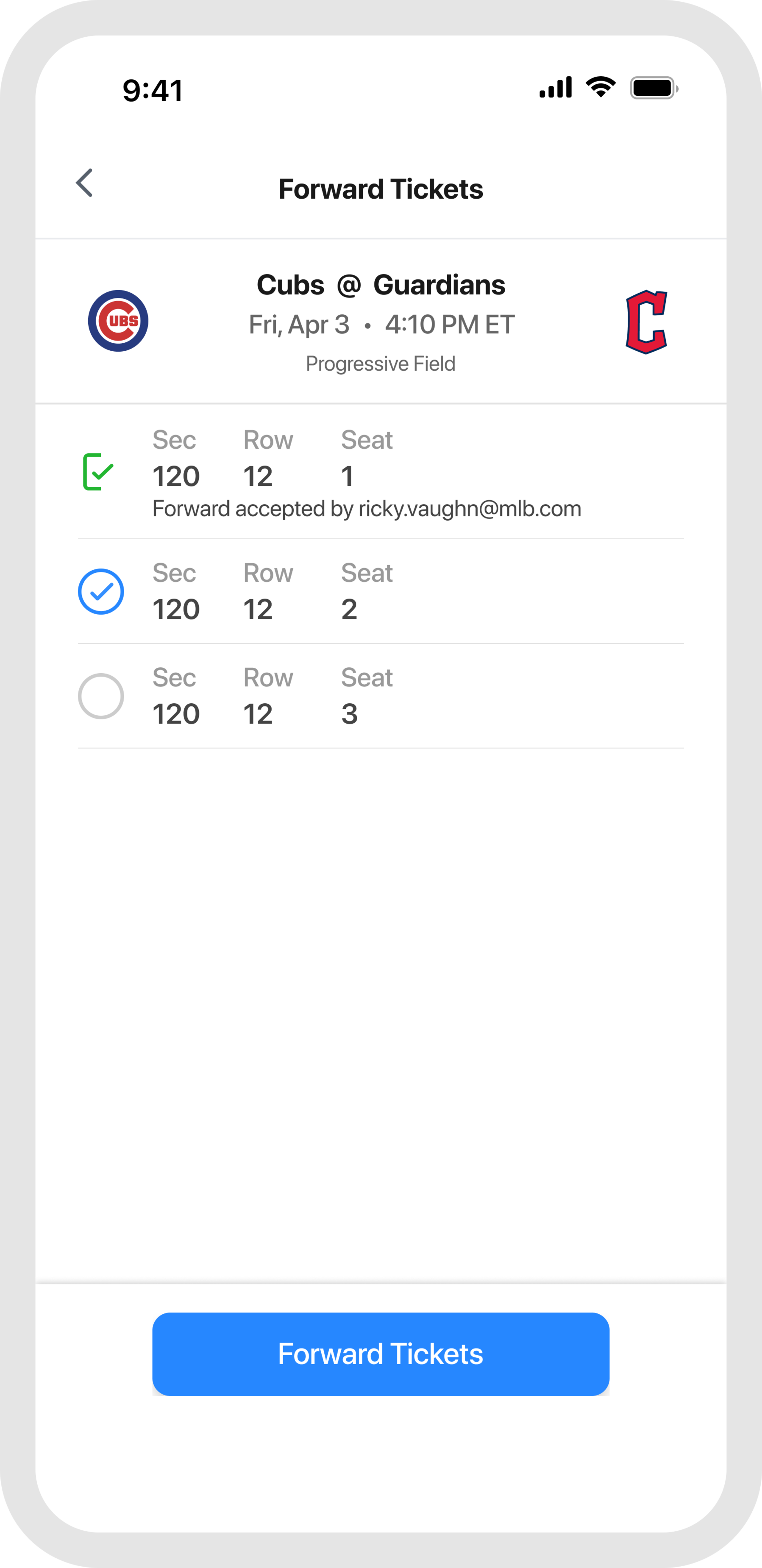 Head to the "Tickets" tab, tap "Wallet," and select the game you are attending. From your ticket list, tap the forward button and choose which tickets to send.