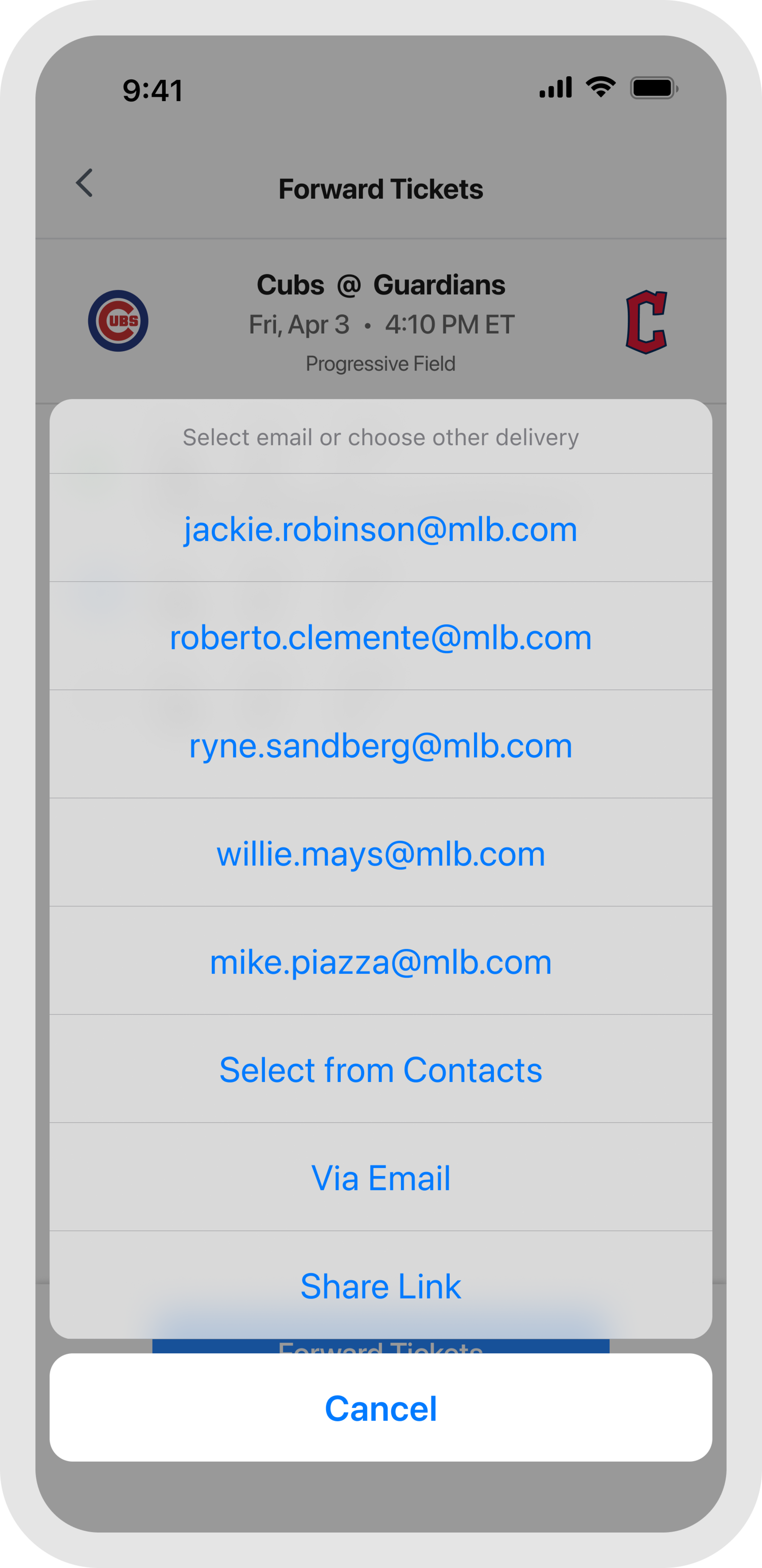 No email address? Use the share link option and send tickets directly through text. Having your number saved in their contacts helps ensure the message does not get filtered as unknown. Once they tap the link, the tickets will be waiting in their MLB Ballpark app account.