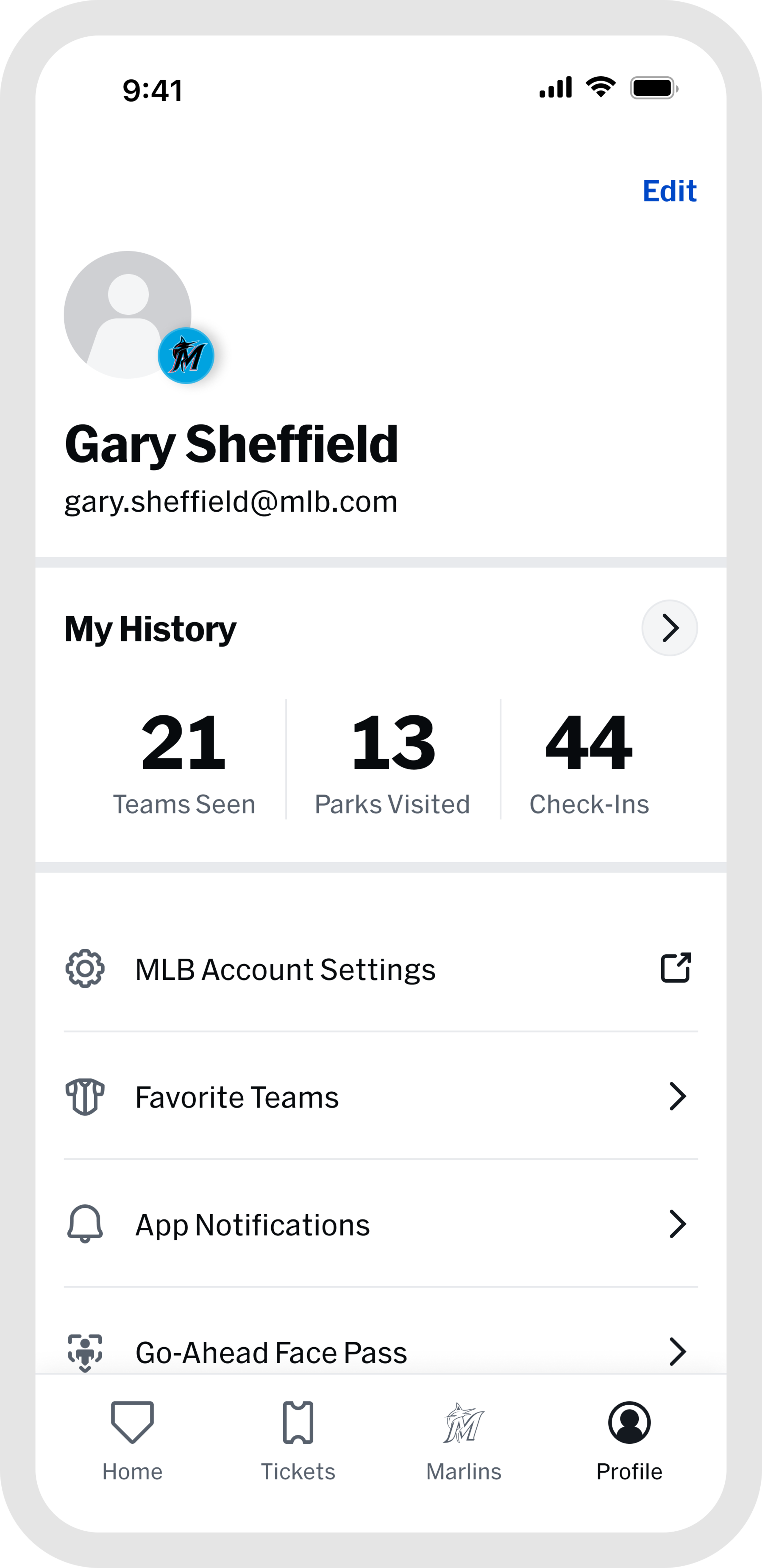 Once you arrive, the "Home" and "Marlins" tabs become your go-to resource for venue details and features that enhance your gameday experience. Capture and preserve your ballpark memories by tapping "My History" within the "Profile" tab.
