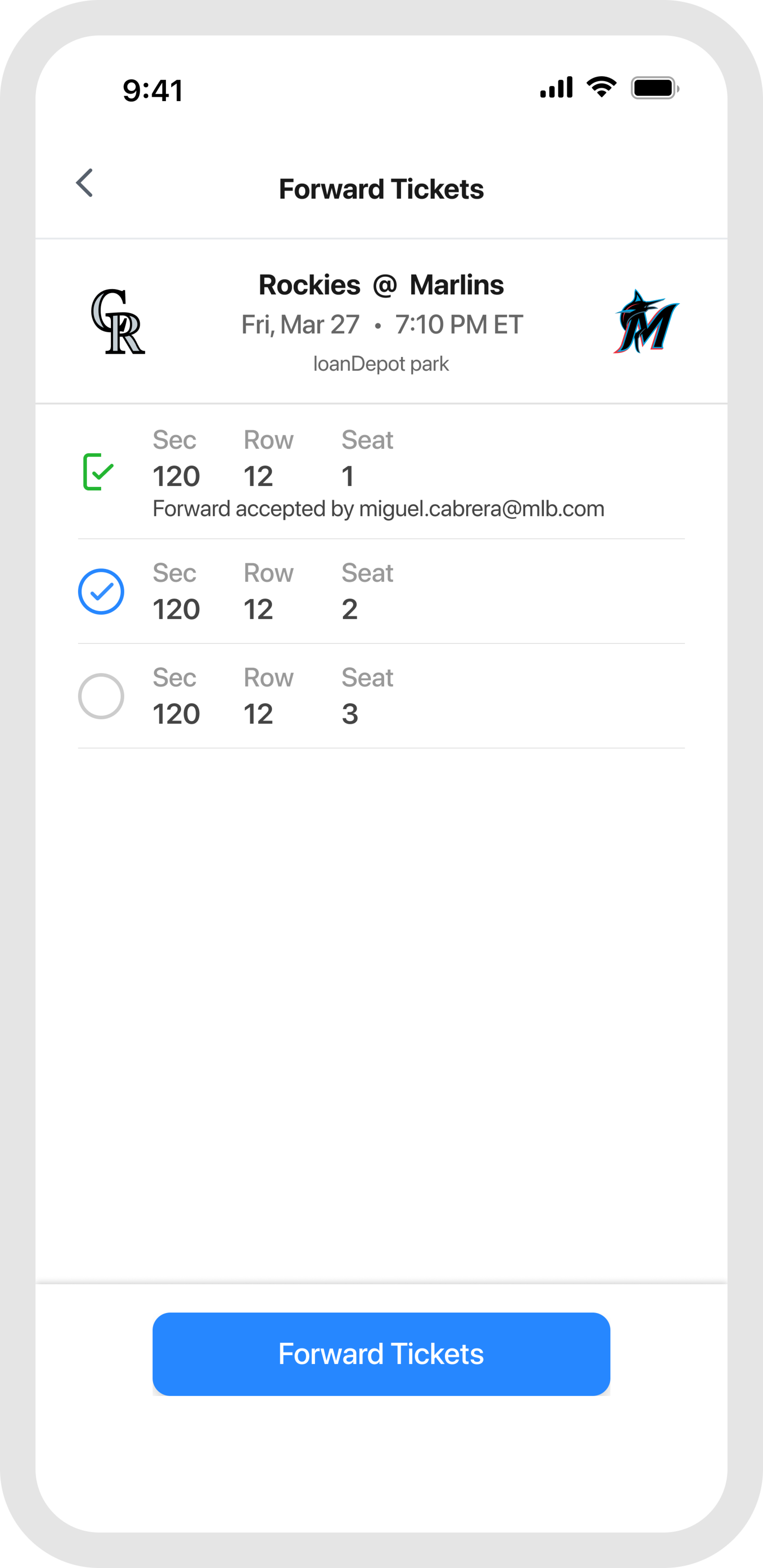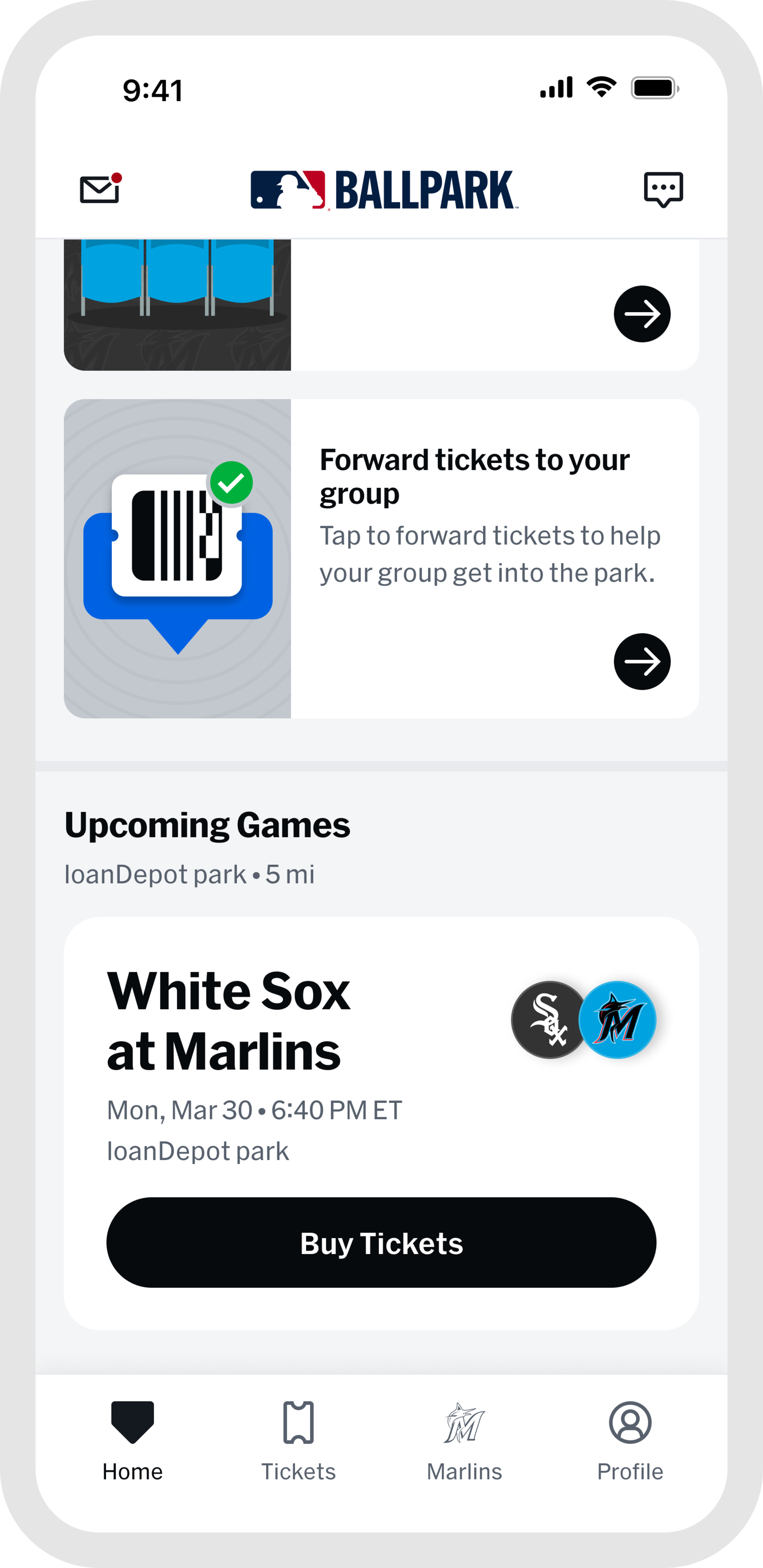 Head to the "Tickets" tab, tap "Wallet," and select the game you are attending. From your ticket list, tap the forward button and choose which tickets to send.