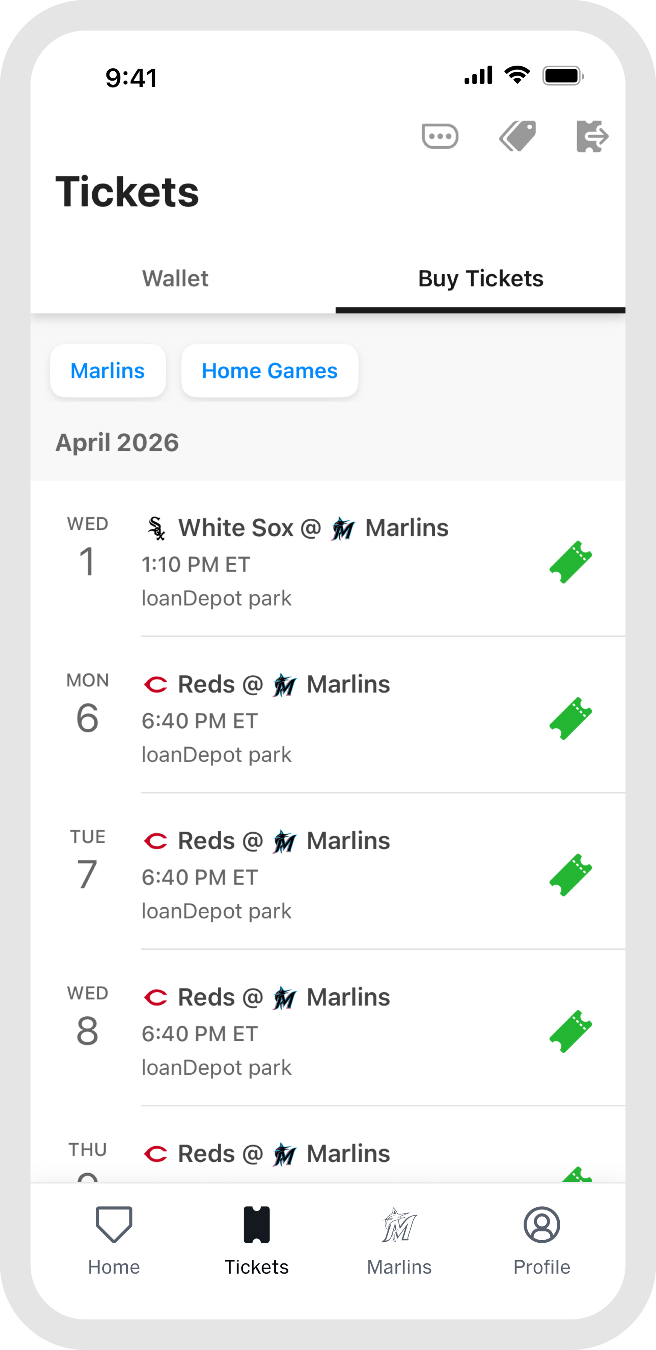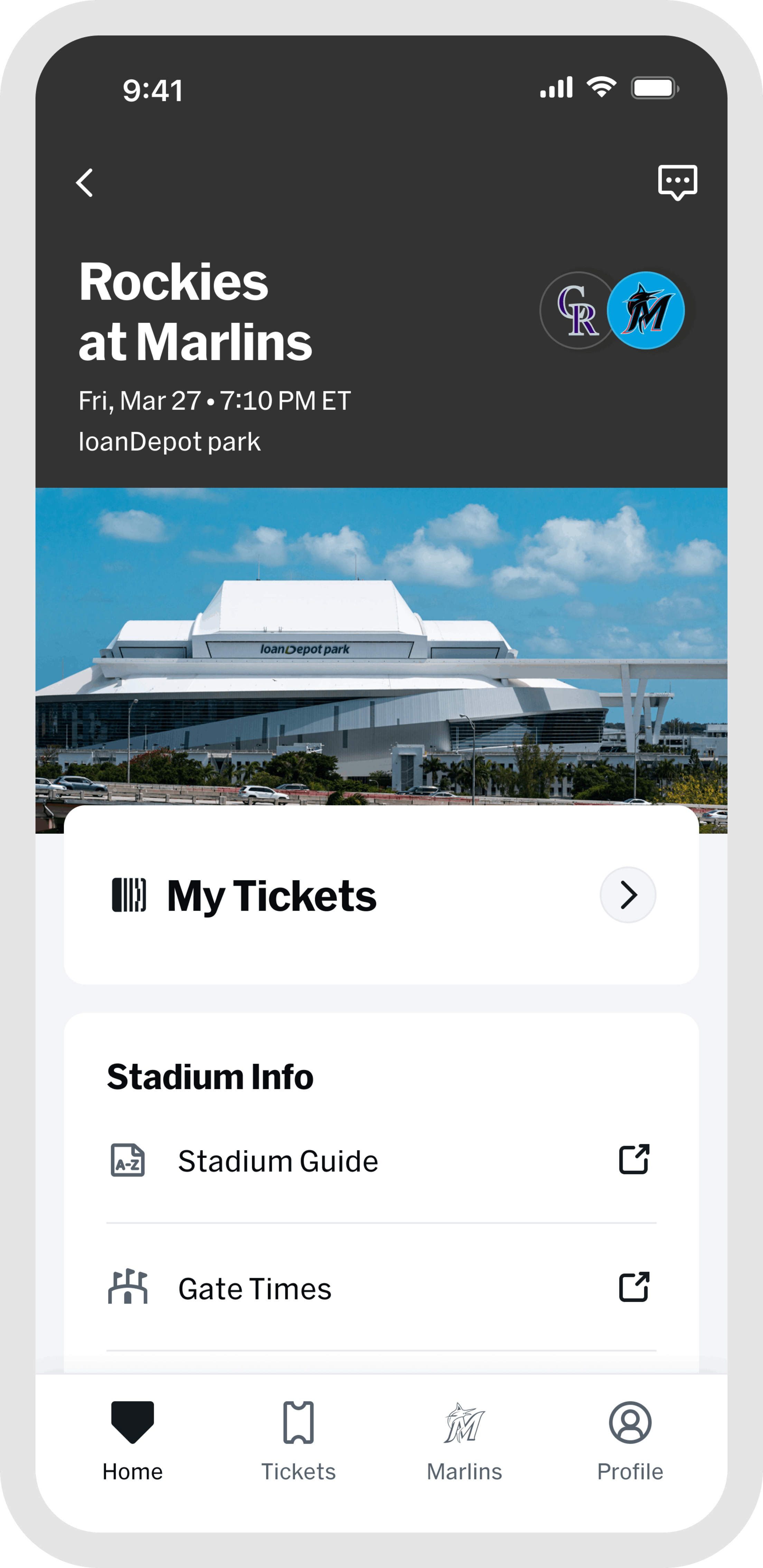 Once you are at the game, the "Home" and "Marlins" tabs are your go-to for everything venue-related. Browse stadium maps, jump into interactive games, find concession info, and access in-game features all designed to make your experience better from first pitch to final out. When the game wraps up, head to "My History" in the "Profile" tab to revisit every game you have attended, all in one place.