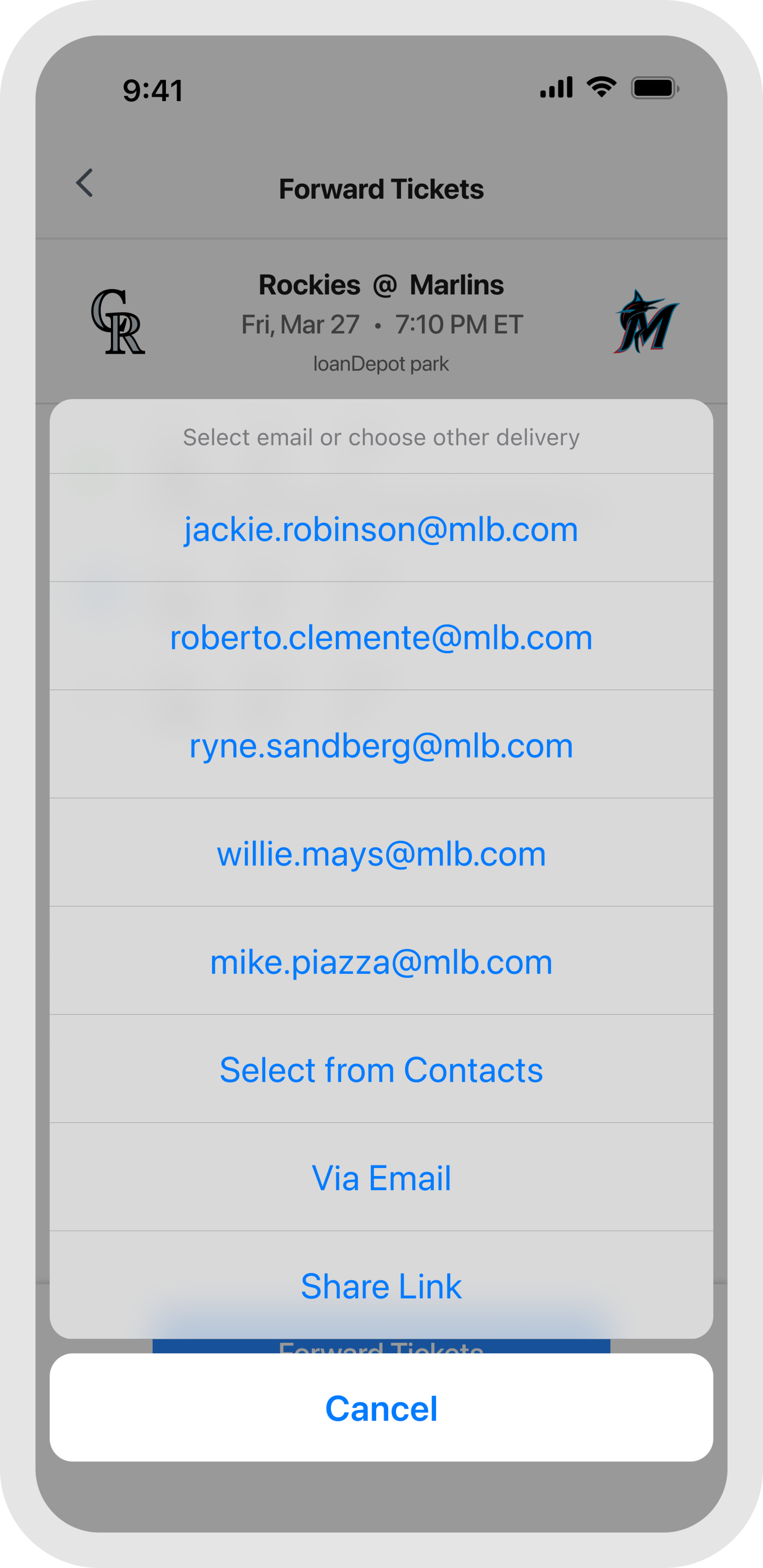 No email address? Use the share link option and send tickets directly through text. Having your number saved in their contacts helps ensure the message does not get filtered as unknown. Once they tap the link, the tickets will be waiting in their MLB Ballpark app account.