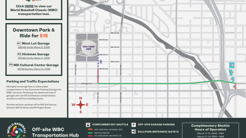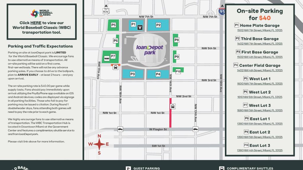 • A World Baseball Classic Transportation Hub has been established in Downtown Miami at the Government Center, with a parking fee of just $15 that includes a complimentary shuttle service to and from loanDepot park.