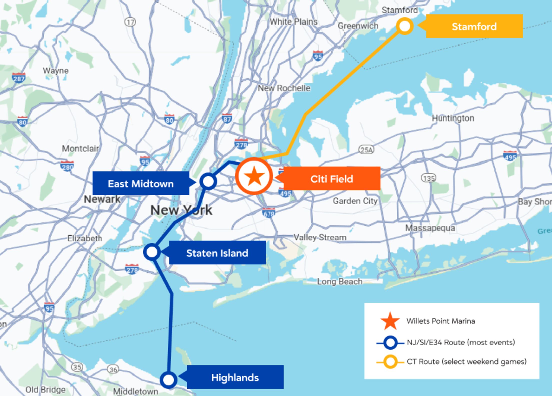 Set sail on the “Homerun,” Seastreak’s brand new vessel custom for the Mets from New Jersey, as well as a new weekend route from Stamford, CT. Multiple routes, multiple boats, and service to Mets home games.