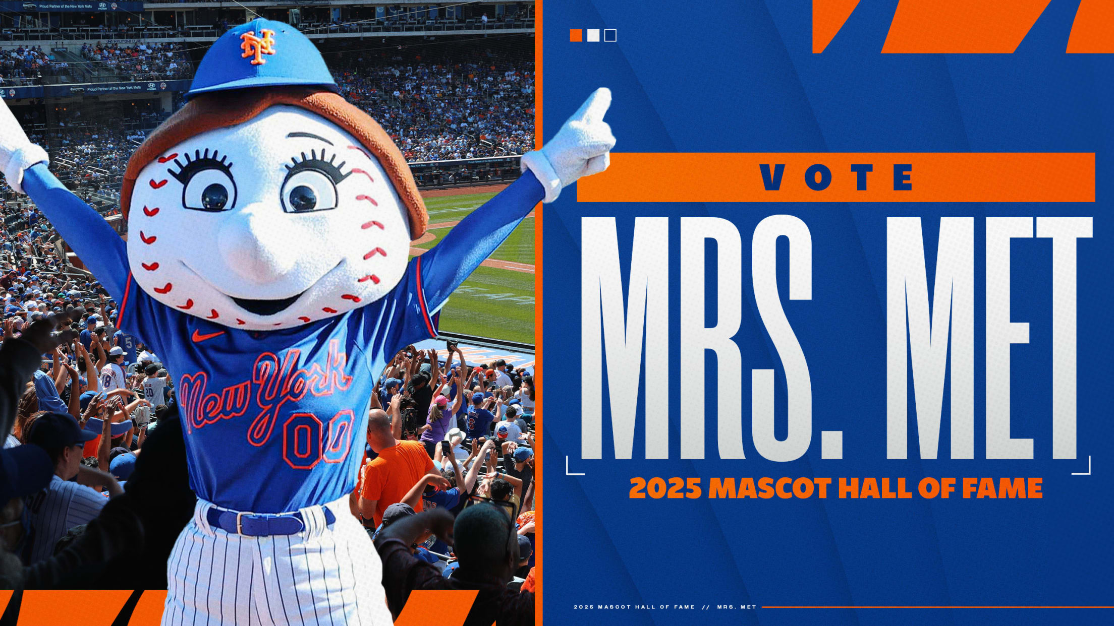 Exciting News! Mrs. Met is on the 2025 ballot for the Mascot Hall of Fame. This is HER year. Mrs. Met is New York. She loves to celebrate the Mets, women in sports, and female fandom. If elected, Mrs. Met will be the first female mascot inducted into the Mascot Hall of Fame. All participants can vote once per day per device. Voting runs May 11-24. Participants can vote for up to 11 mascots each day.