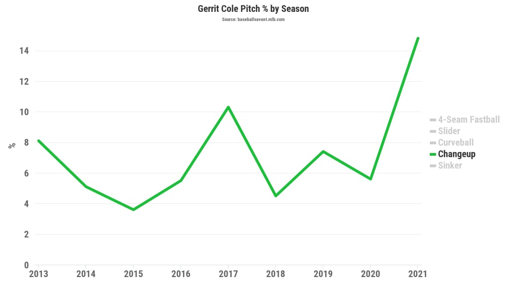From 2018-20, when Cole had two strikes on a hitter, he threw them a changeup only 5% of the time. In 2021, he throws two-strike changeups 17% of the time, and it's working.