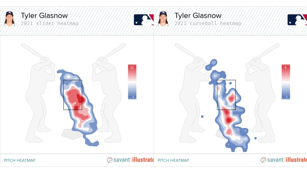 He uses each breaking pitch to attack hitters in a specific way. Glasnow attacks the strike zone with his slider; he throws it within the zone or on the edges 59% of the time. His curveball, on the other hand, he buries below the zone; it's a chase pitch 56% of the time.