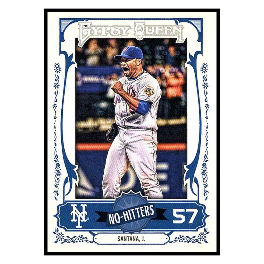 On this Gypsy Queen card, Santana pumps his fist and screams in triumph as he completes the feat at Citi Field.