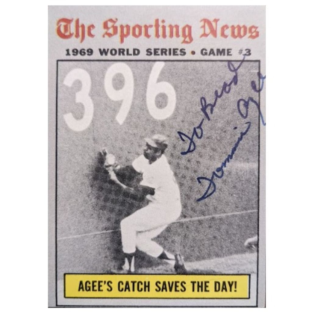 Agee’s first catch was immortalized by Topps in the company’s 1970 set. Titled “Agee’s Catch Saves The Day!” the card shows the outfielder as he slams into the wall just below the 396-feet sign in left-center field at Shea Stadium.