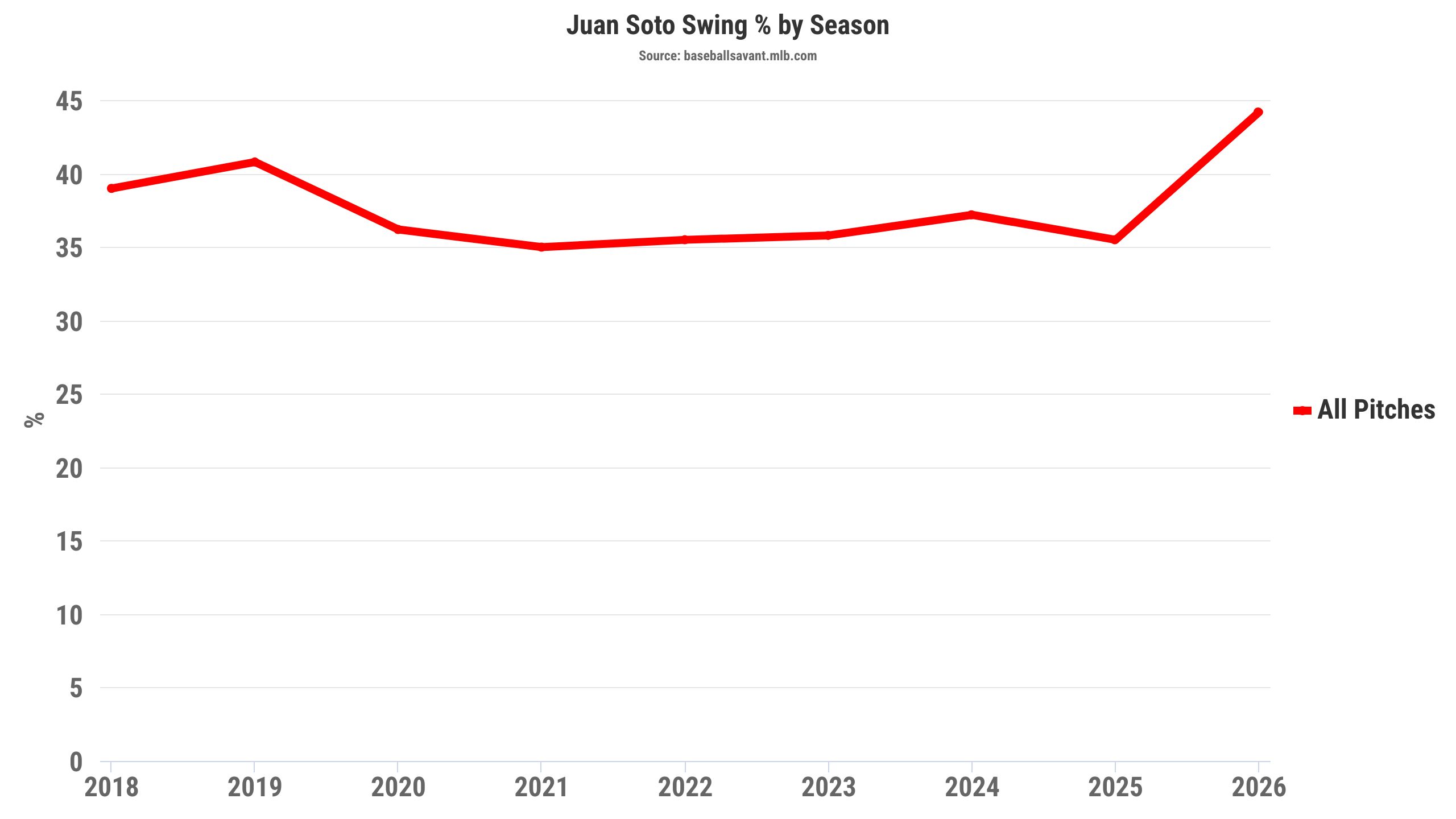 At the very least, though, it’s notable that Soto is also being more aggressive than usual, albeit in a very small sample size. His swing rate (44.2%), swing rate on pitches in the strike zone (69.1%), and chase rate (24.2%) are all well above his career averages. It certainly feels like this is all connected.