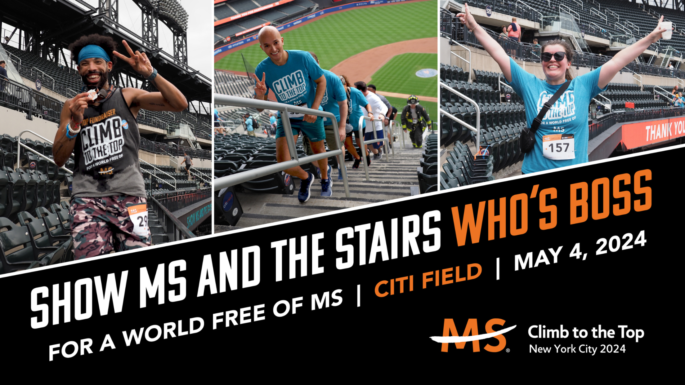 Ready to take on the stairs at Citi Field? Climb to the Top MS: New York City is your chance to conquer the stairs at your favorite ballpark and change the lives for people affected by MS. Your climb will start from an exclusive spot in Citi Field, where you will then climb up and down the stairs, serpentine-style, with rest stops along the way to refuel. At the finish line, you will be greeted by an incredible view, a cheer section, a finish line medal and a place to gather to enjoy concession-style food and drinks!