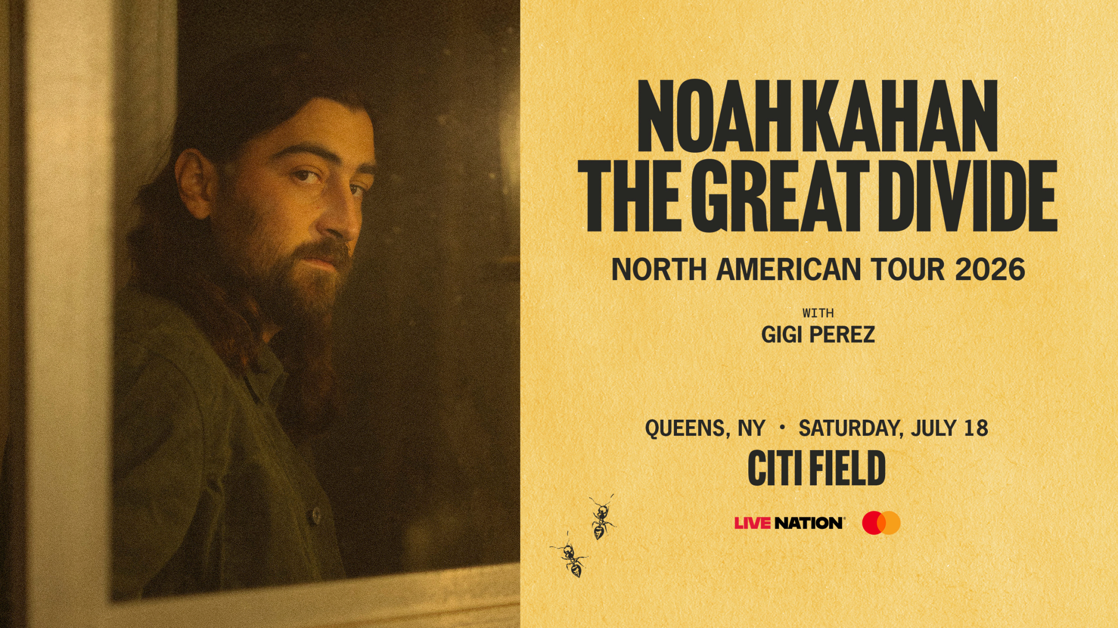 Noah Kahan will be returning to the road this summer for a monumental, career-defining stadium run. Produced by Live Nation, Noah Kahan: The Great Divide Tour makes 23-stops at stadiums across North America, including Citi Field on Saturday, July 18, 2026. Gigi Perez is set to join Kahan as support.