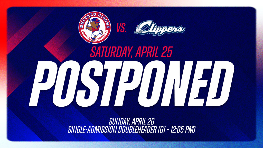 The Bisons will make up the game against the Clippers with a single-admission doubleheader on Sunday, April 26 at Sahlen Field with the first of two seven-inning contests beginning at 12:05 p.m. (Gates: 11:30 a.m.). As a single-admission doubleheader, fans will only need one ticket for both games and all existing tickets for Sunday, April 26 are still valid. Fans may enter the ballpark at any time during either game.