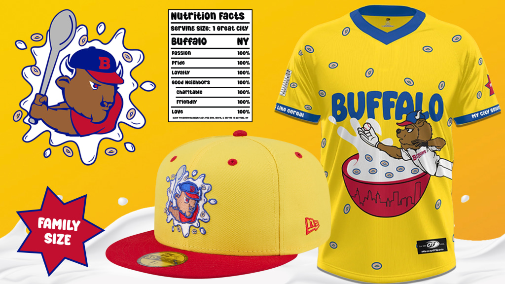 The Bisons cereal-themed jersey emulates the classic cereal box design, combining bright colors with exciting images and characters. Of course, for the Bisons that means the beloved Buster is front and center, diving into a bowl of cereal to catch a falling fly ball. The red cereal bowl, which showcases the City of Buffalo skyline, combines with the blue ‘Buffalo’ across the chest to bring the team’s primary colors into the club’s first ever morning-sun yellow jersey. A ‘Family Size’ Patch on the left shoulder signifies that both a delicious bowl of cereal and Bisons baseball are perfect for the whole family to enjoy. Meanwhile, the ‘Nutritional Facts’ Patch on the right shoulder proudly shows that the amazing residents of Buffalo provide this great city with 100% of its daily requirements of passion, pride, loyalty, charity, friendliness and love!