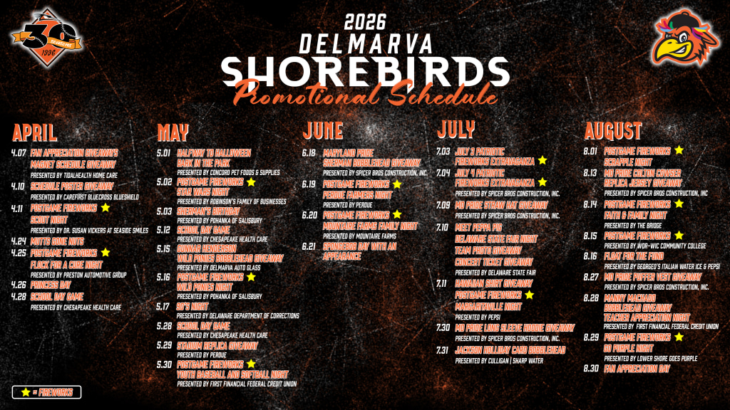 As we prepare for the 30th season of Shorebirds baseball, we are excited to announce the Shorebirds 2026 promotional schedule! The 2026 season of Shorebirds baseball features: