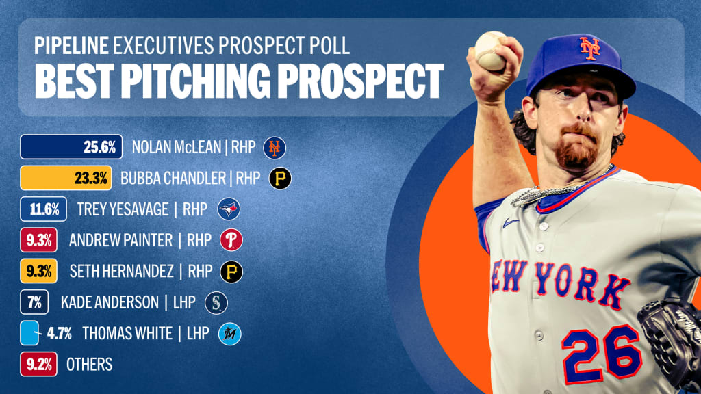 In the Rookie of the Year votes for both leagues, it was interesting to see so many respondents picking a hitter with no big league experience over pitchers who debuted under the spotlight of a playoff push and the postseason itself in 2025. In this survey question, those two arms finished in the top three. Nolan McLean was the Mets’ best starter down the stretch in 2025 and most expect him to pick up where he left off this year. His AL counterpart from the ROY polling, Trey Yesavage, was a postseason hero who pitched meaningful World Series innings. But he actually finished third here, with the Pirates’ Bubba Chandler getting more support. Keep in mind, this isn’t about who will have the best 2026, but who is the better long-term prospect. While Chandler’s results in the Minors last year were a bit inconsistent, his combination of stuff and athleticism never waned, and he also looked very good at the end of his big league debut.