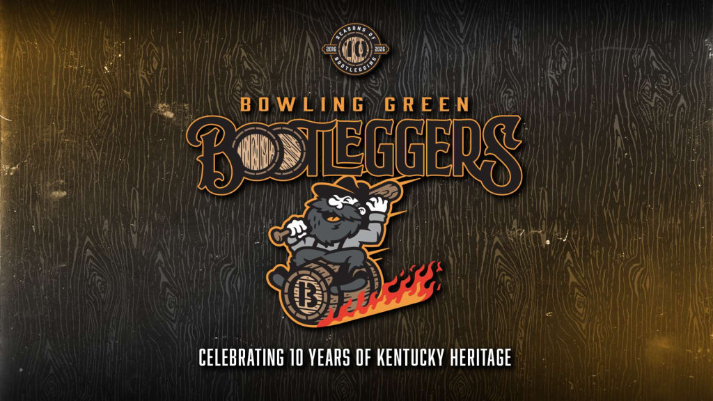 The Bowling Green Bootleggers are one of the longest-running alternate identities in all of Minor League Baseball, debuting in 2016 and utilized by the Hot Rods in every season since. The name and logo pays tribute to the renegades who produced and distributed illicit moonshine throughout the state of Kentucky, sometimes using their hot rods to outrun Johnny Law. The team will play as the Bootleggers for every Thursday home game, beginning on April 9. 2026's jerseys are inspired by the color of a charred bourbon barrel; the hat puts the spotlight on a bat-wielding bearded bootlegger riding high atop a flaming barrel. Drink up.