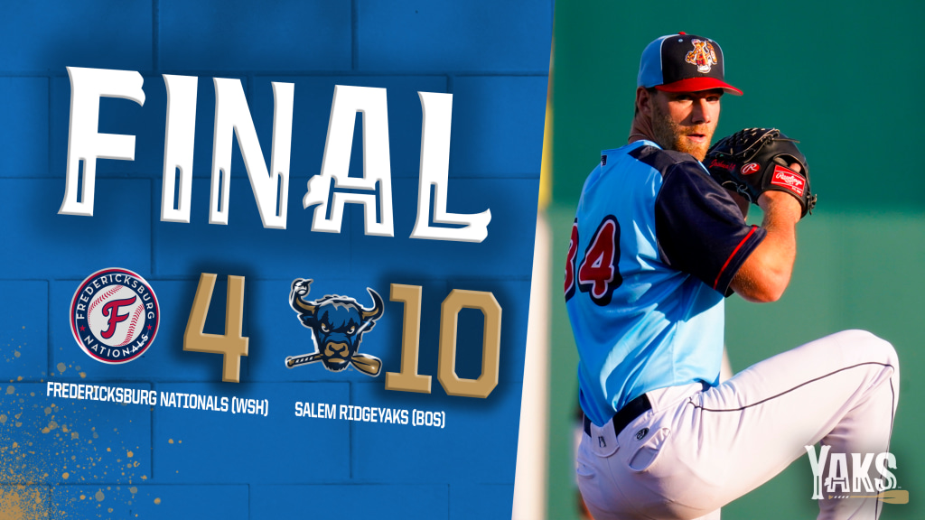 SALEM, Va. – Led by Dylan Brown’s sensational start and Stanley Tucker's two-run shot, the Salem RidgeYaks (10-8) picked up their third victory in the last four games in a 10-4 victory over the Fredericksburg Nationals (11-7) on Thursday evening at Carilion Clinic Field at Salem Memorial Ballpark.