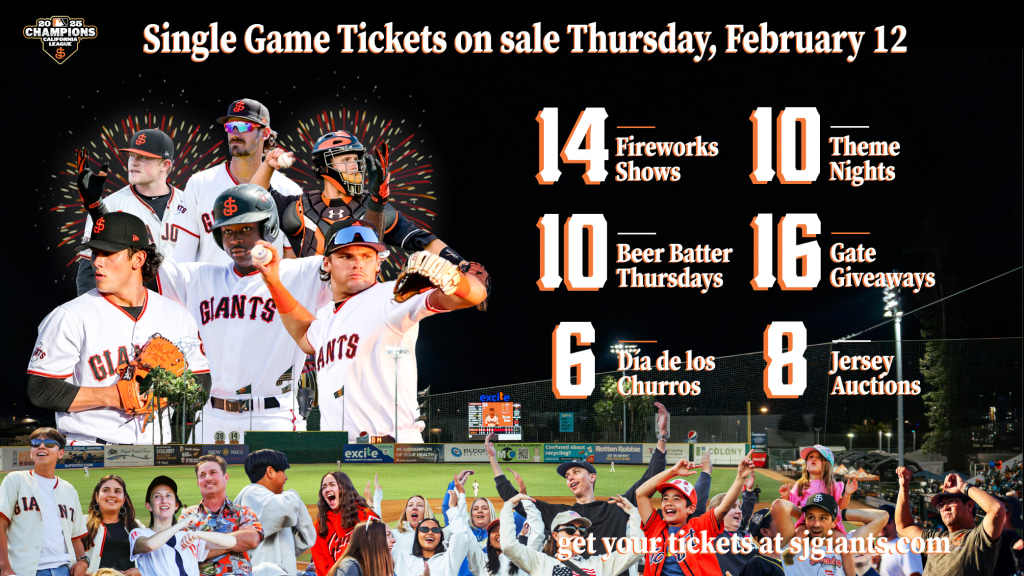 San Jose Giants single game tickets will go on sale Thursday, February 12 at 10:00 AM. The San Jose Giants 2026 Opening Night is Tuesday, April 7 at Excite Ballpark against the Visalia Rawhide. Ticket packages and groups are on sale now. For more information on Ticket Offers call 408.297.1435, visit the Excite Ballpark Box Office or log on to sjgiants.com.