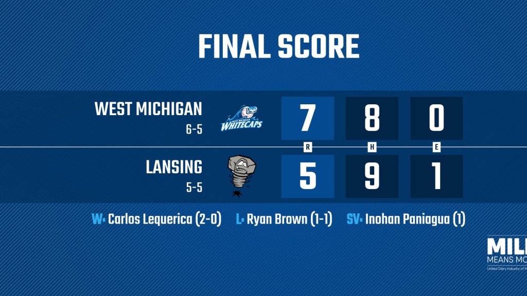 West Michigan climbs over the break-even mark to 6-5 on the early season, while Lansing drops to an even 5-5. Whitecaps reliever Carlos Lequerica (2-0) tossed two perfect innings out of the bullpen, striking out three to earn his second win of the year. In his two seasons with West Michigan, the Miami native has a combined 10-0 record and a 2.20 ERA in 47 games. Lugnuts righty Ryan Brown (1-1) takes his first loss after giving up the go-ahead home run by Santana in relief. Inohan Paniagua tossed a scoreless ninth in collecting his first save since his days as a St. Louis Cardinals minor leaguer in 2021. Jackson Strong reached base three times with a run scored, an RBI, and a pair of walks in the victory.