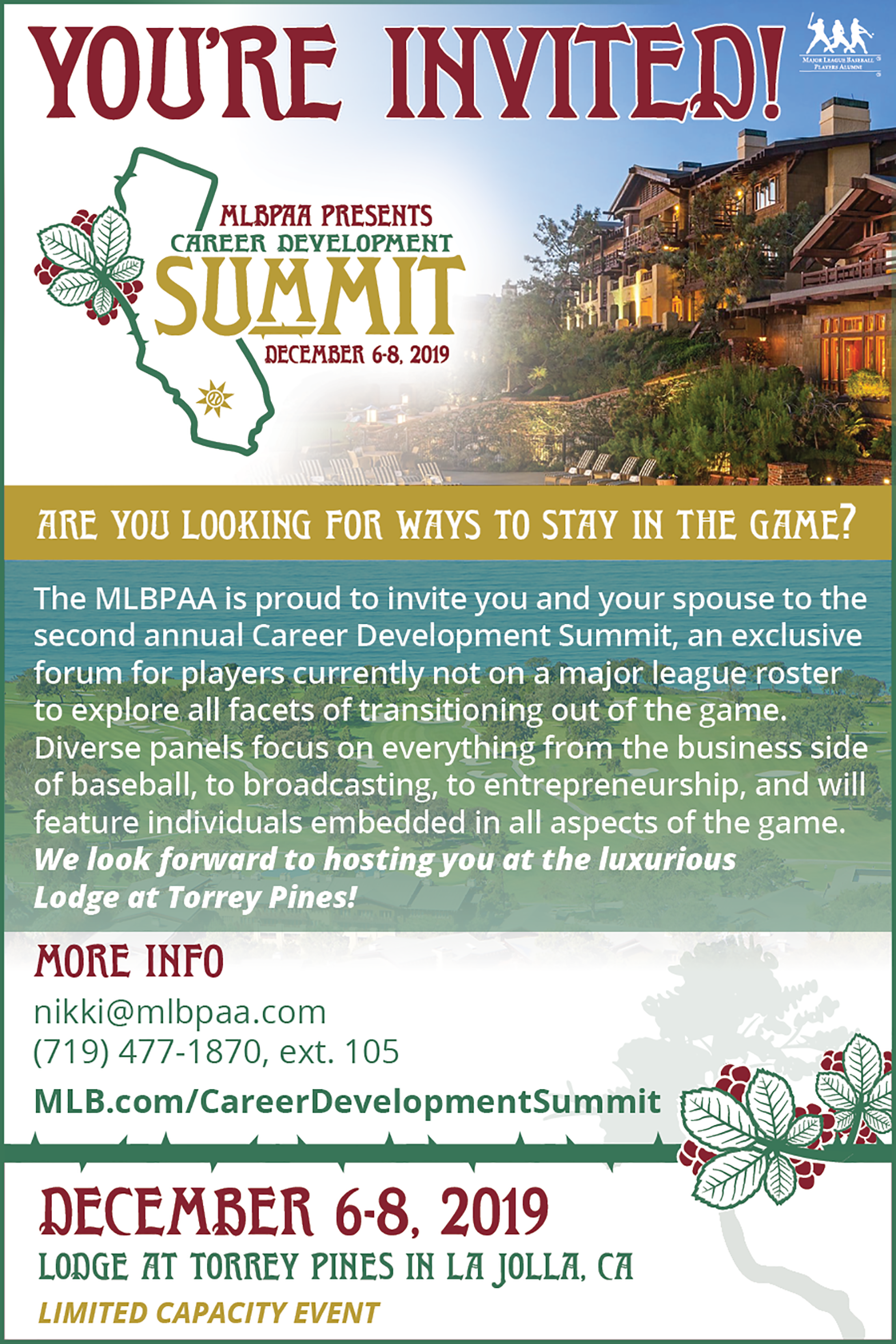 The Major League Baseball Players Alumni Association (MLBPAA) is pleased to announce the second annual Career Development Summit to be held on Saturday, Dec. 7 and Sunday, Dec. 8 at the Lodge at Torrey Pines in La Jolla, California. This event will serve as an exclusive forum for players not on a roster, looking to explore all facets of transitioning out of the game. Stay tuned for more updates!