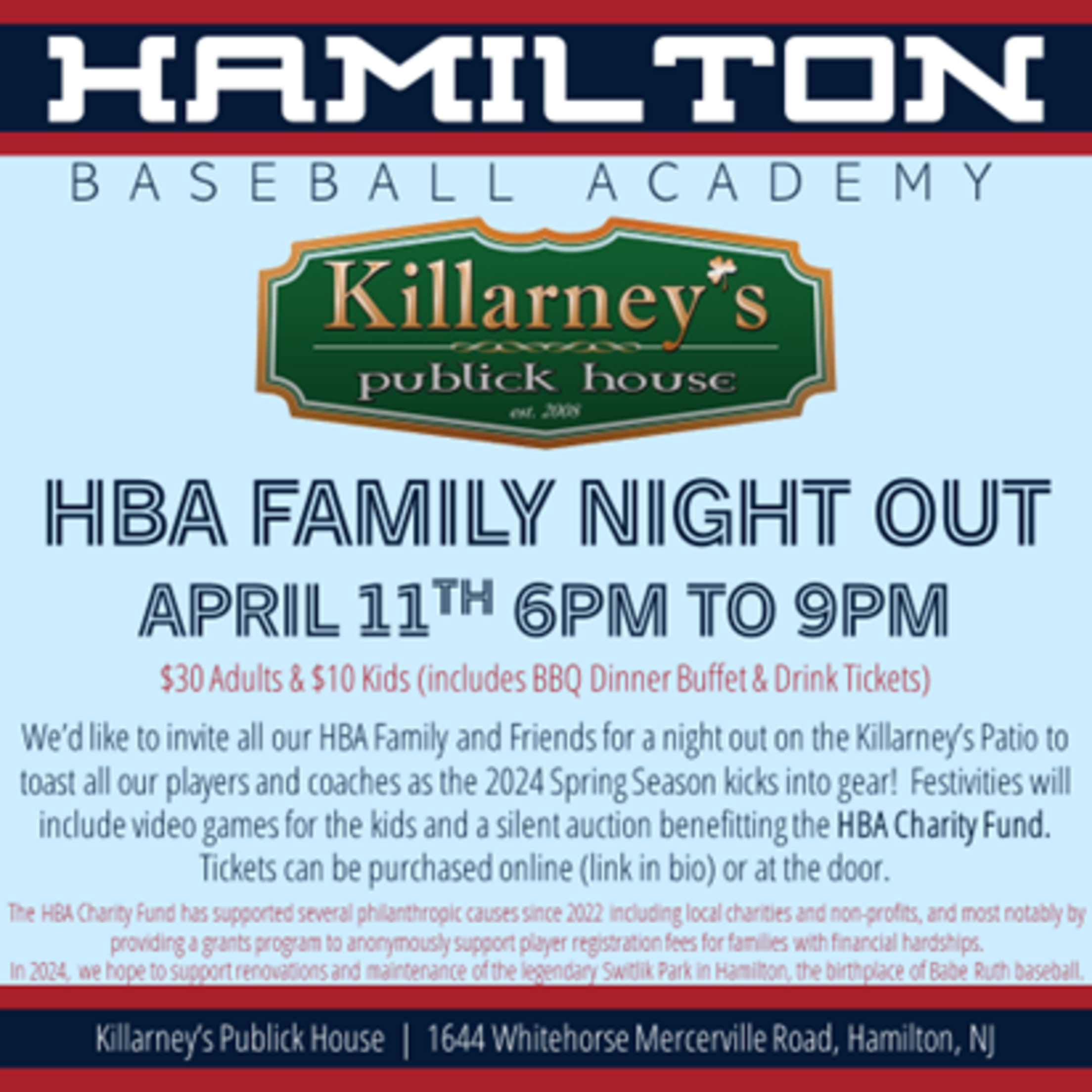 We’d like to invite all our HBA Family and Friends for a night out to Killarney’s Patio to toast all our players and coaches as the 2024 Spring Season kicks into gear! Festivities will include video games for the kids and a silent auction benefitting the HBA charity fund.