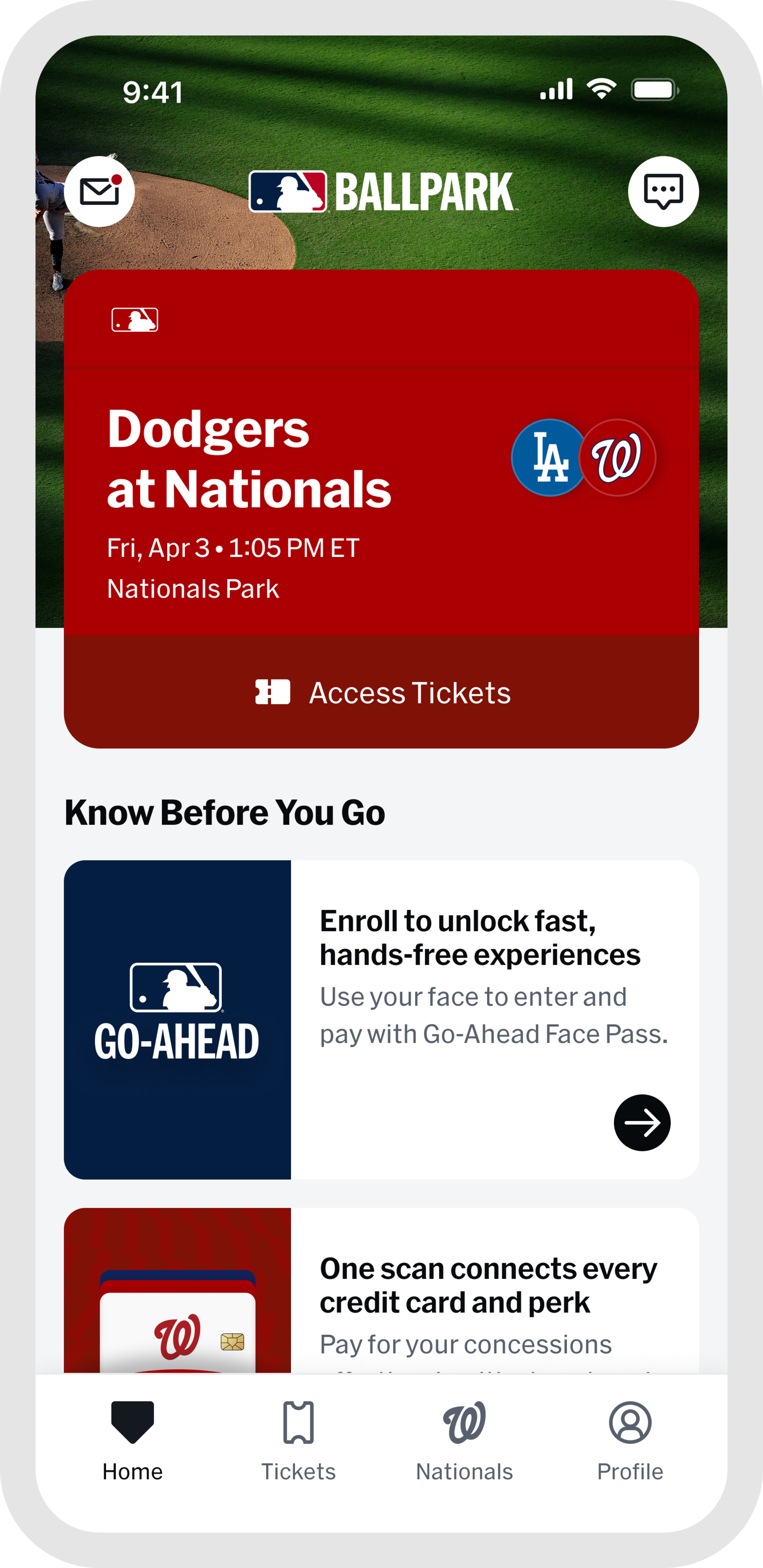 MLB encourages fans to keep their eyes on the ball with a fast, hands-free way to enter the stadium using the new MLB Go-Ahead Entry lanes at Nationals Park. Fans 18+ can simply opt in and register using the MLB Ballpark app and all tickets tied to their account will be eligible for Go-Ahead Entry.