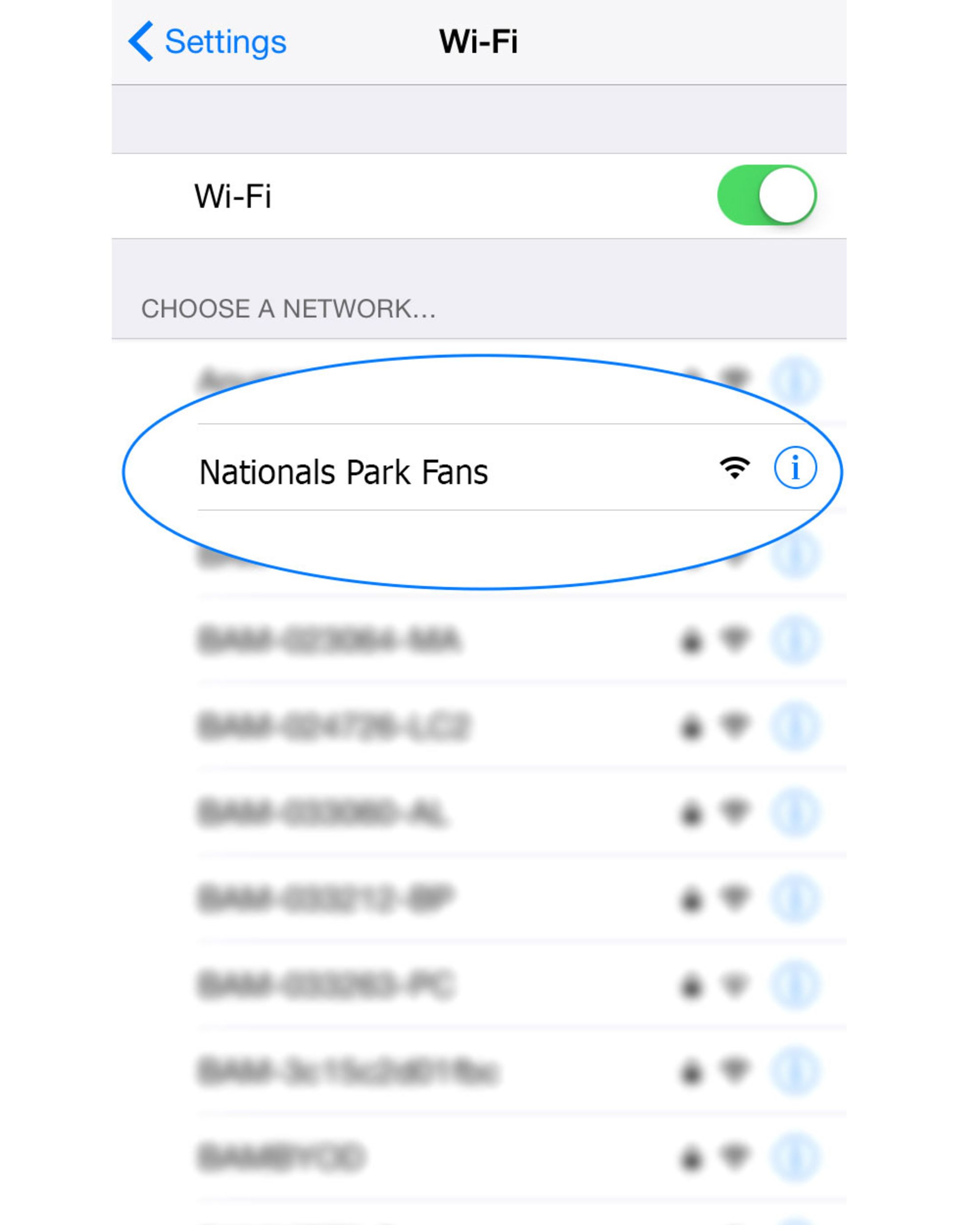 Nationals Park Fans is a FREE WiFi network available to all guests at Nationals Park. Connect to the WiFi network by searching for the "Nationals Park Fans" SSID in Settings. No username or password is required to connect.
