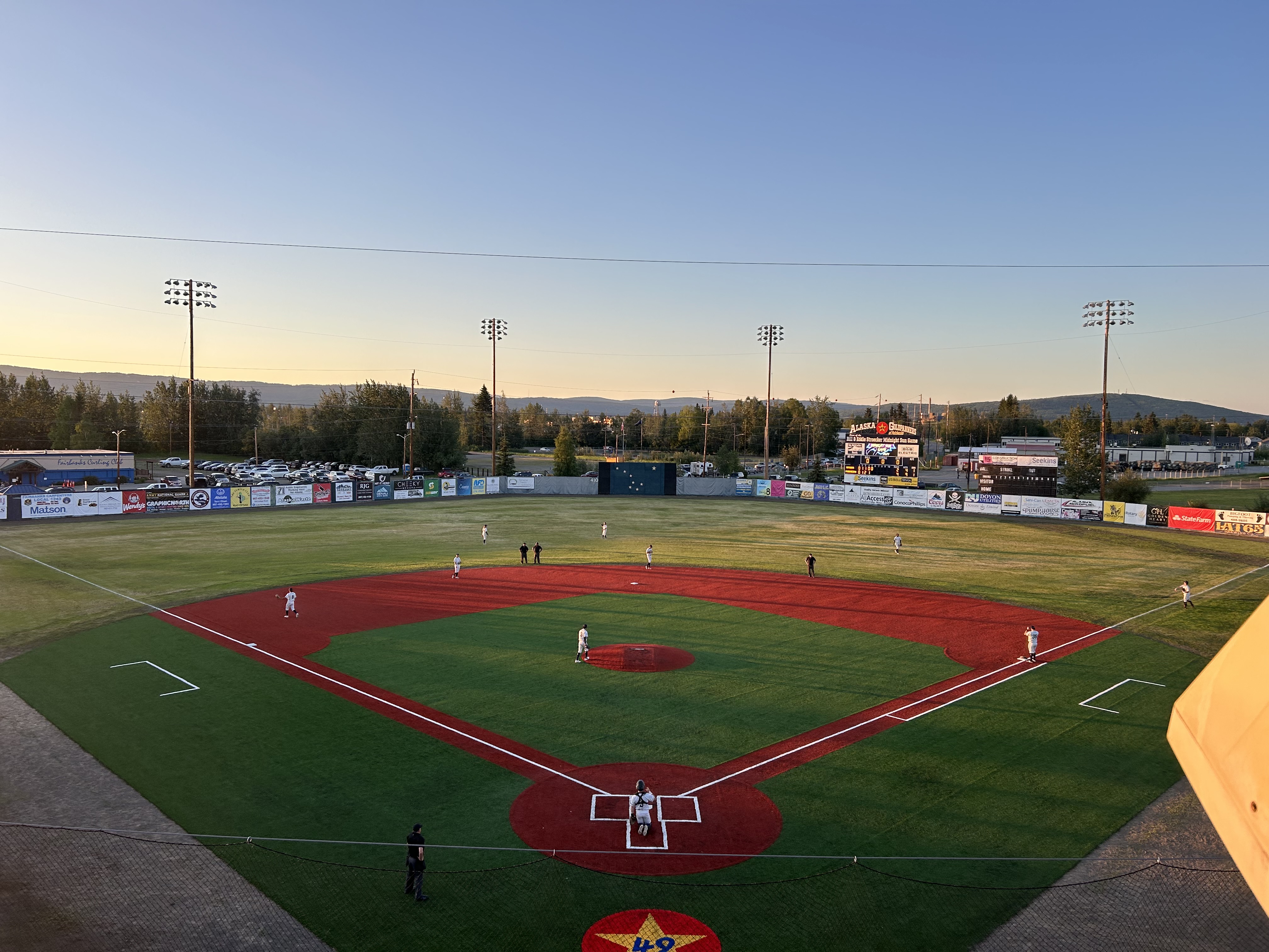 "An 11:30 p.m. shot from the press box of Growden Field during Alaska’s annual Midnight Sun Game."
