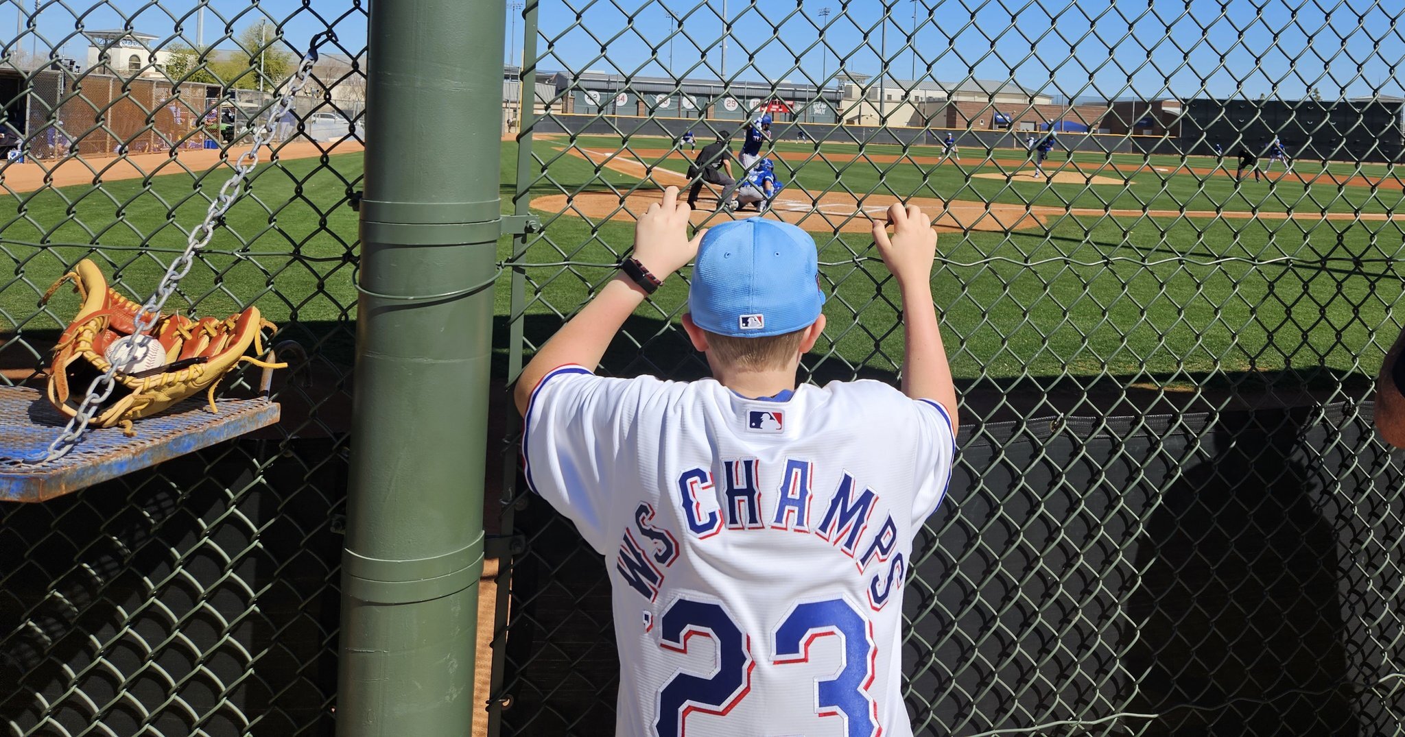 "A young Rangers fan wearing a 'WS Champs '23' jersey looks on as Adolis García -- who crushed eight home runs during Texas' World Series run -- hits in a 'B' game during Spring Training."