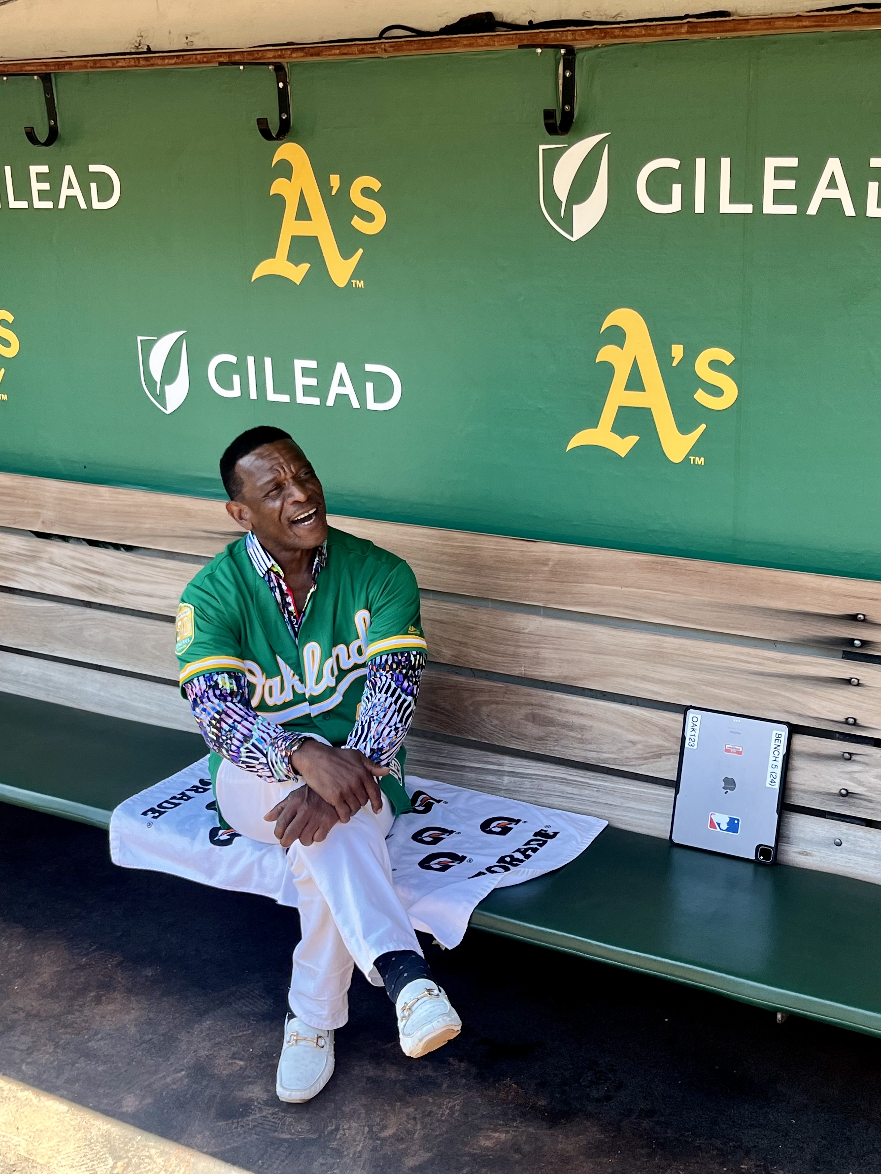 "Rickey Henderson looks off into the distance before throwing out the first pitch at the A’s final game at the Oakland Coliseum."