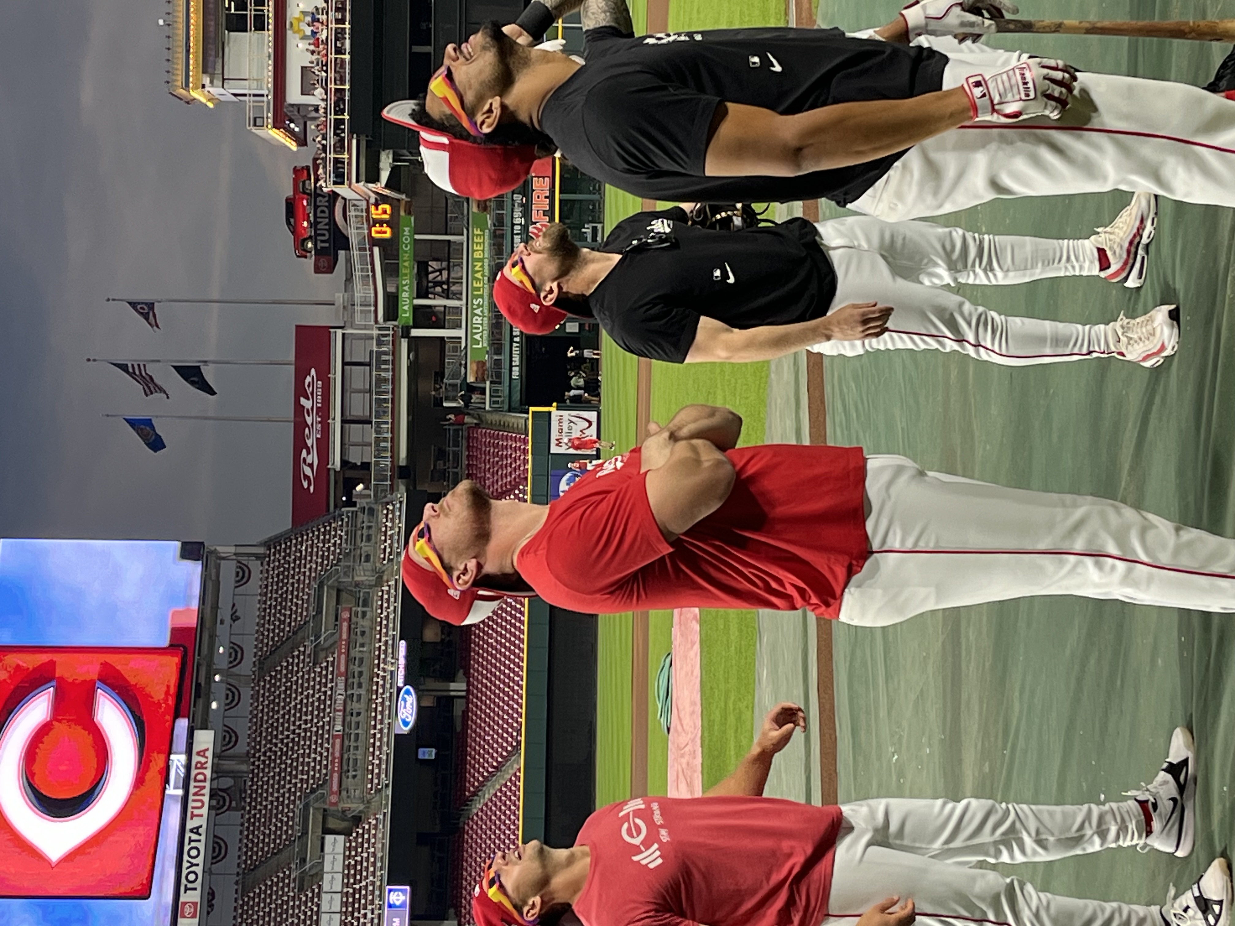 "Reds players checked out the solar eclipse from the field at Great American Ball Park on April 8. The eclipse occurred just as the Reds were taking batting practice before playing the Brewers. As the sky grew darker, the players became like any other curious person. Someone provided them with the glasses required to view the eclipse safely and, for a few moments, everybody looked up. Then they went back to work and resumed hitting."