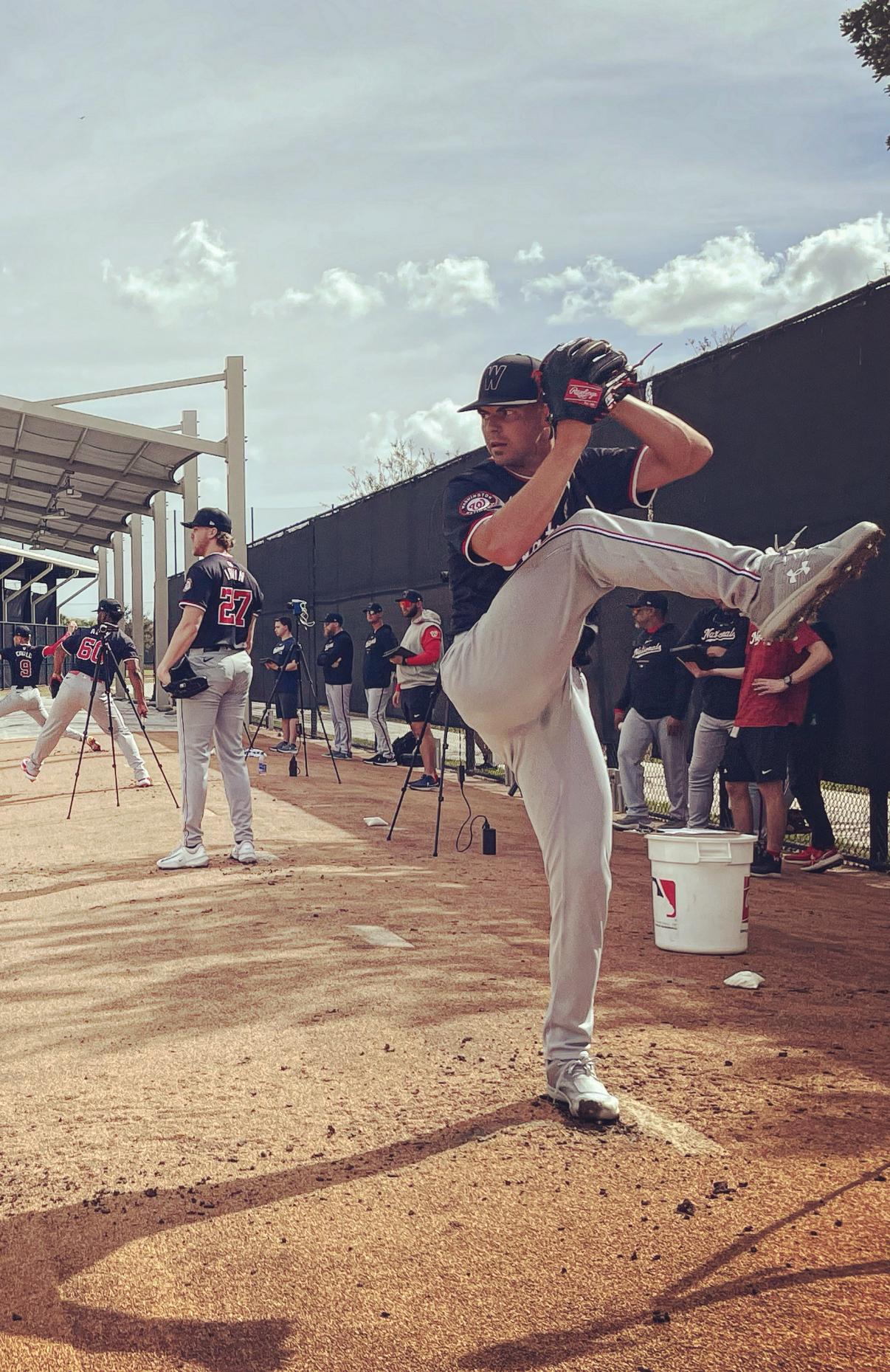 "Nats southpaw MacKenzie Gore ramps up for the 2024 season during Spring Training, throwing off the mound with his signature delivery."