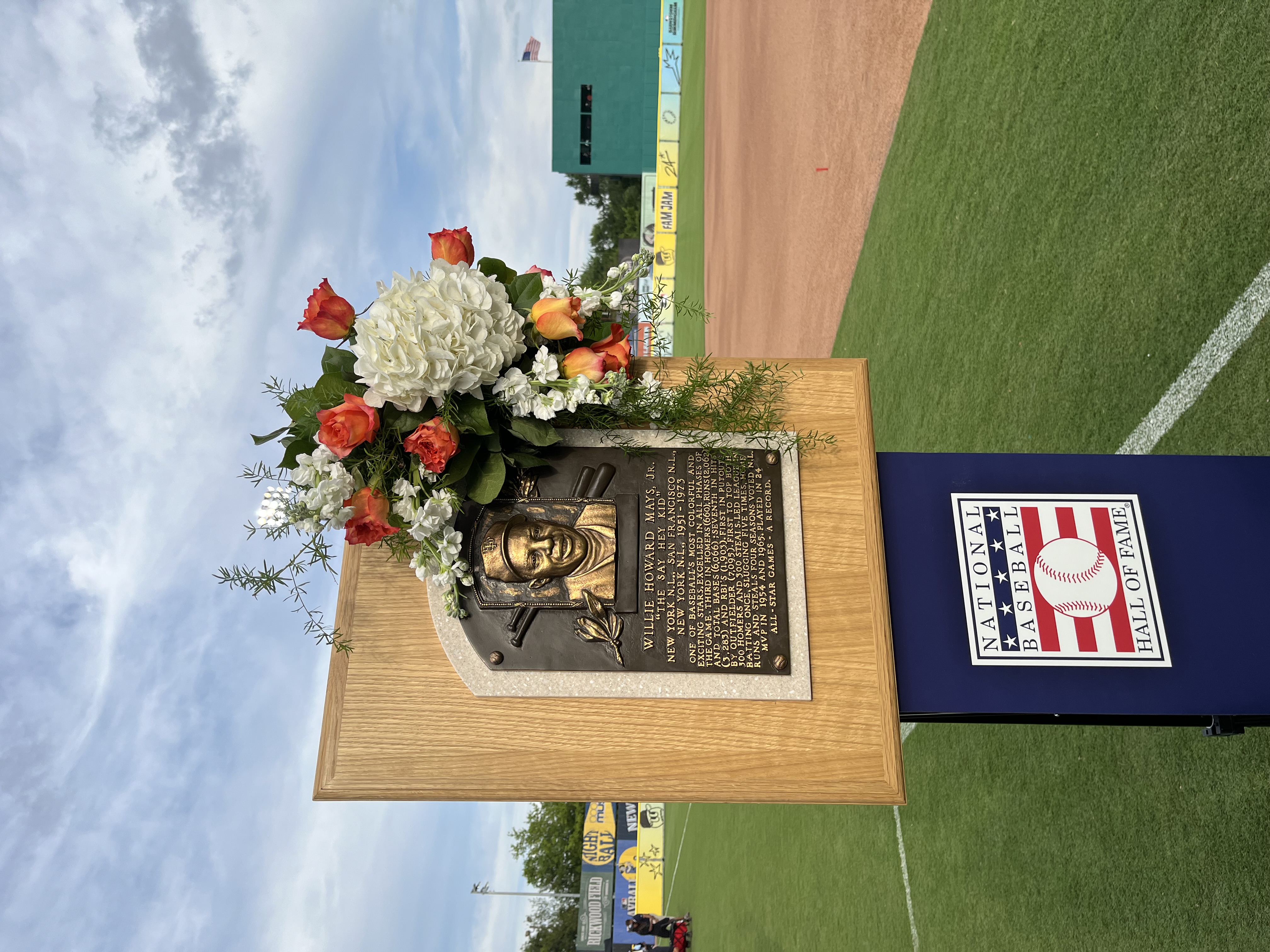 "Willie Mays' Hall of Fame plaque was brought from Cooperstown, N.Y., to Birmingham, Ala., where Mays' Giants and the Cardinals played MLB's first regular-season game at Rickwood Field, the oldest professional ballpark in the country and the site where Mays’ career began in 1948 as a 17-year-old with the Birmingham Black Barons of the Negro Leagues. Mays passed away two days before that June game, and this plaque on the field was one of many reminders throughout Rickwood and Birmingham that week of his presence and impact."